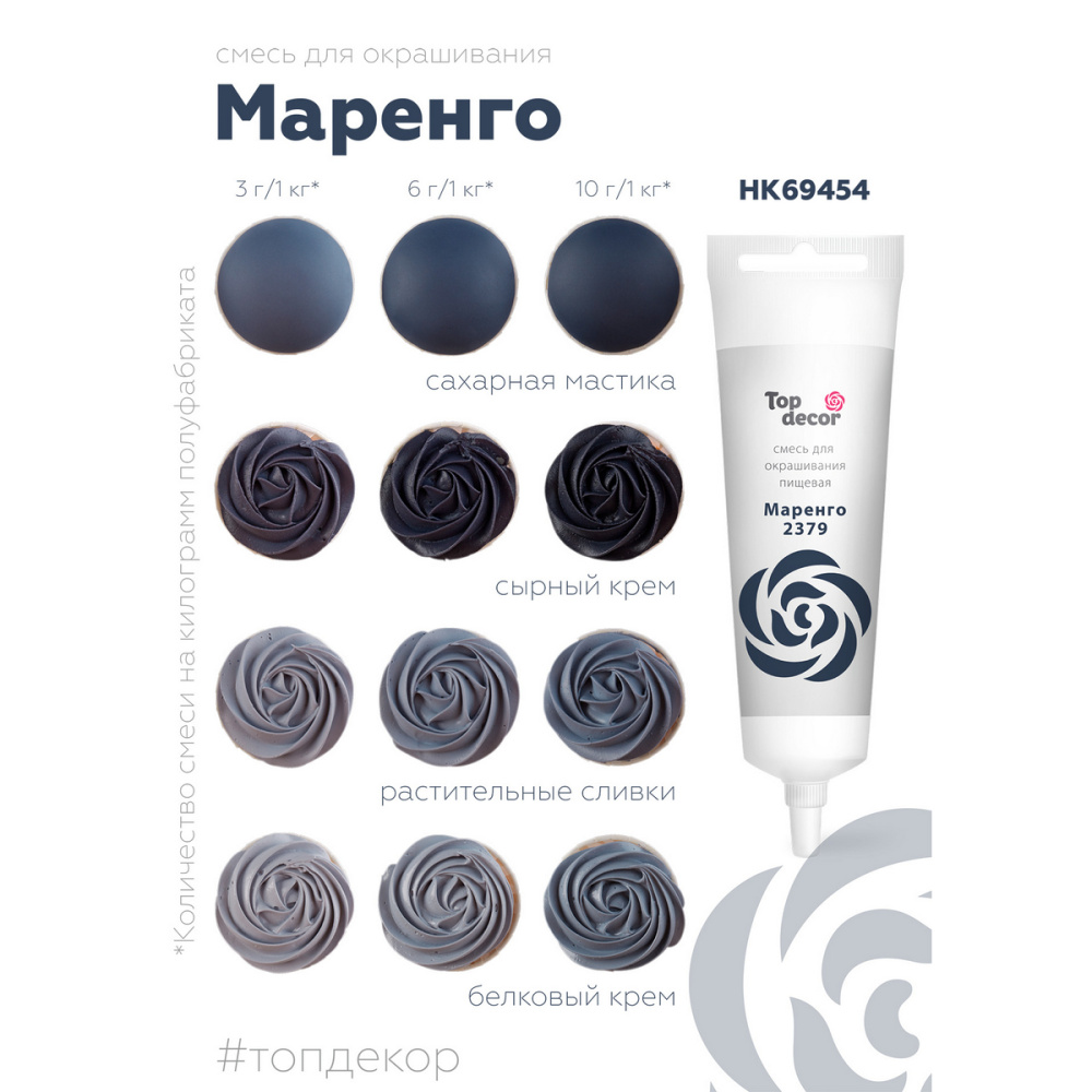 Краситель водорастворимый с высокой концентрацией красящего пигмента. Густая консистенция позволяет ему хорошо окрашивать по всей массе основные кондитерские полуфабрикаты (желе, мусс, крем, тесто, мастика и другие), не изменяя их консистенцию. Не имеет вкуса и аромата, благодаря чему сохраняет первоначальные вкусовые свойства окрашиваемого продукта. Рекомендуемая дозировка: 2-3 капли (0,1-0,15 г) на 100 грамм окрашиваемой массы. Продаётся в тюбике по 100 грамм. Способ применения: перед применением проколите пломбу тюбика, срезать не рекомендуется.