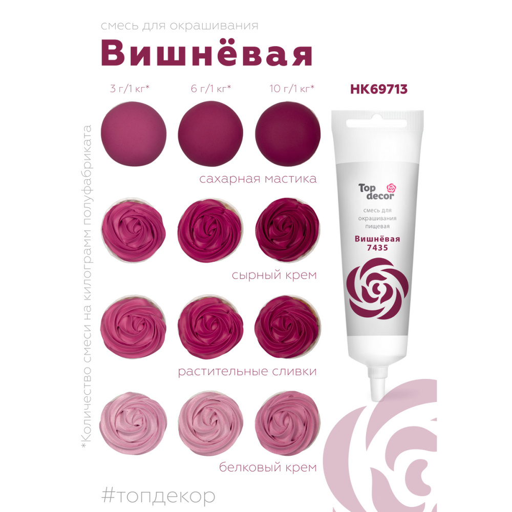 Краситель водорастворимый с высокой концентрацией красящего пигмента. Густая консистенция позволяет ему хорошо окрашивать по всей массе основные кондитерские полуфабрикаты (желе, мусс, крем, тесто, мастика и другие), не изменяя их консистенцию. Не имеет вкуса и аромата, благодаря чему сохраняет первоначальные вкусовые свойства окрашиваемого продукта. Продаётся в тюбике по 100 грамм. Способ применения: перед применением проколите пломбу тюбика, срезать не рекомендуется.
