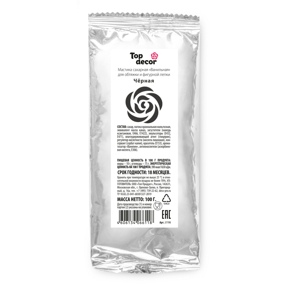 Сахарная мастика с тонким ароматом ванили — уникальный кондитерский полуфабрикат для декорирования изделий. Создана на основе эквивалента какао-масла, благодаря чему является универсальной массой для обтяжки тортов, фигурной лепки, а также для создания тонких элементов декора. Мастика легко окрашивается любыми пищевыми красителями, для создания перламутрового эффекта рекомендуется использовать сухой блестящий краситель. Ассортиментная линейка мастики представлена самыми актуальными оттенками, которые идеально смешиваются друг с другом, расширяя цветовую палитру для вашего творчества. Продаётся в фольгированных пакетах по 100 грамм. Способ применения: разогреть в руках необходимое количество мастики, размять на сухой, слегка подпыленной крахмалом поверхности (во избежание прилипания) до мягкой пластичной консистенции. По желанию добавить краситель или смешать с мастикой другого цвета, использовать для декорирования или лепки. Рекомендации по применению мастики для покрытия тортов: поверхность стола предварител