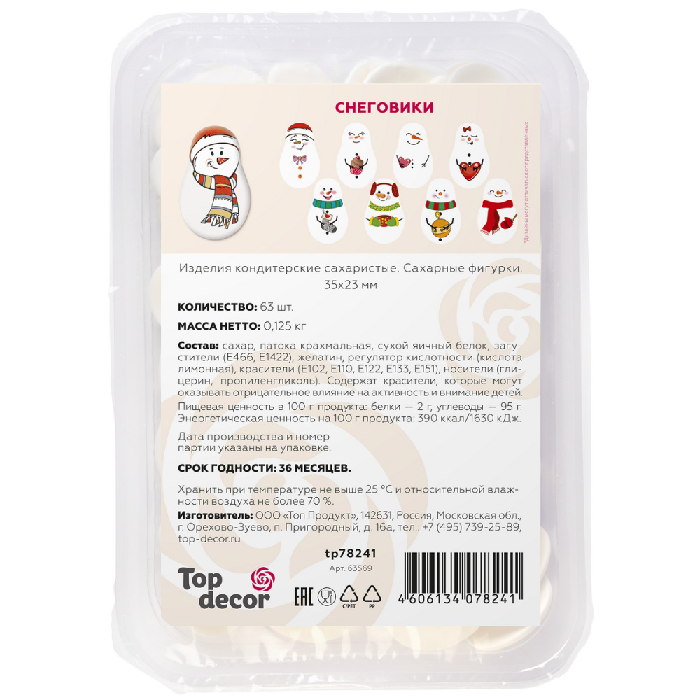 Состав продукта: сахар, патока крахмальная, сухой яичный белок, загустители (Е466, Е1422), желатин, эмульгатор (Е473), масло растительное (триглицериды со средней длиной цепи), регулятор кислотности (кислота лимонная), красители (Е102, Е110, Е122, Е133, Е151), носители (глицерин, пропилегликоль). Содержат красители, которые могут оказывать отрицательное влияние на активность и внимание детей. Пищевая ценность в 100 г продукта: белки — 2,5 г, жиры — 0,1 г, углеводы — 75 г. Энергетическая ценность на 100 г продукта: 310ккал/1300кДж.