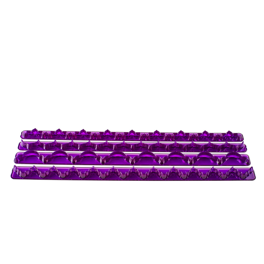 Пластиковые резаки предназначены для изготовления краёв для покрытия торта и прочих кондитерских изделий. Также могут выступать в качестве оттиска для создания объёмного рисунка в процессе декорирования. Длина резаков: 255мм. Высота резаков: 10мм, 10мм, 12мм, 15мм.