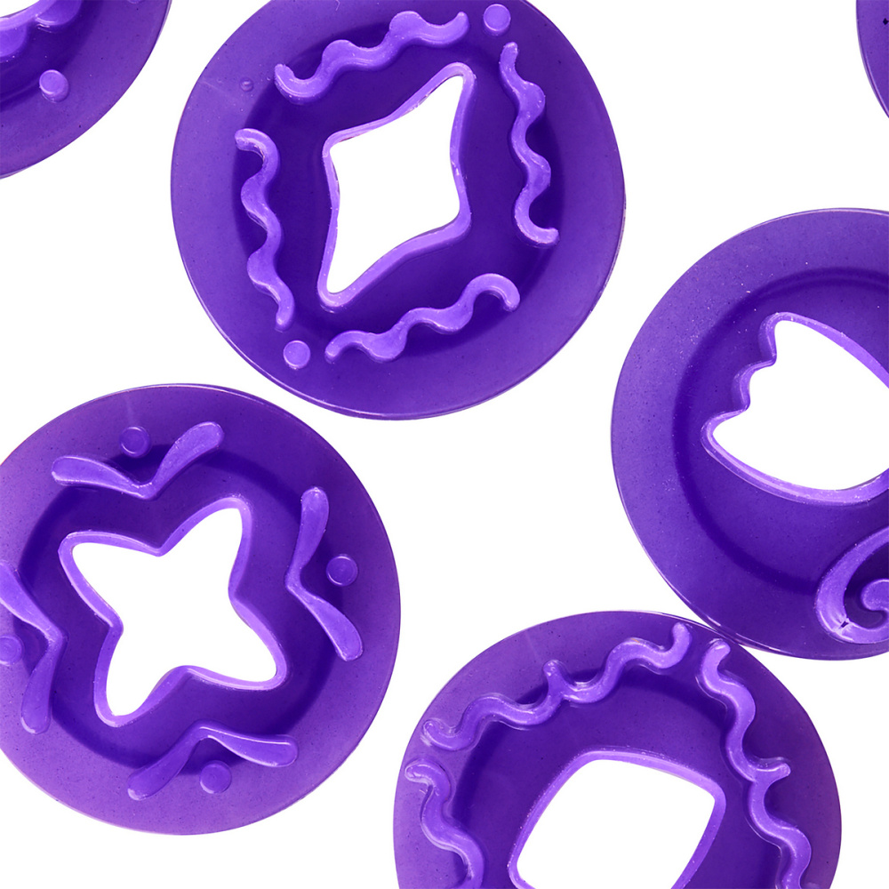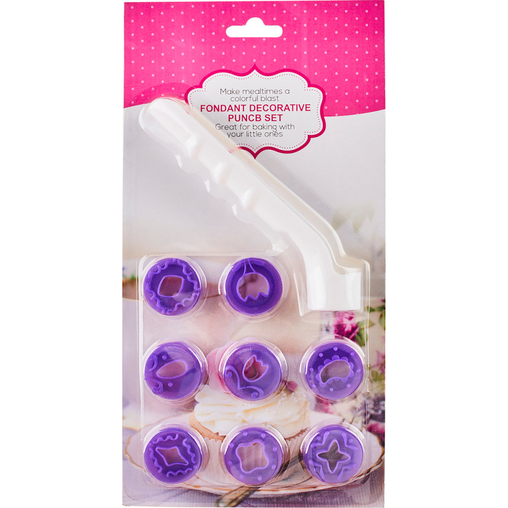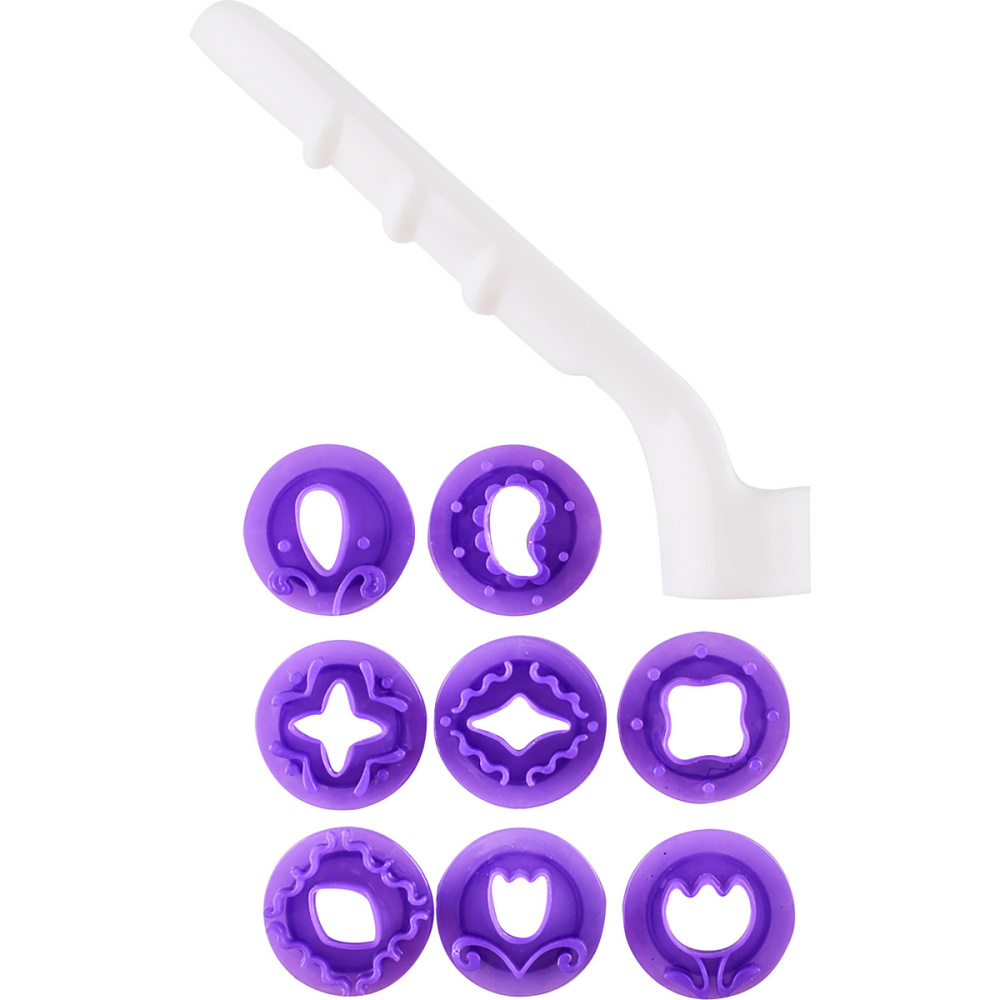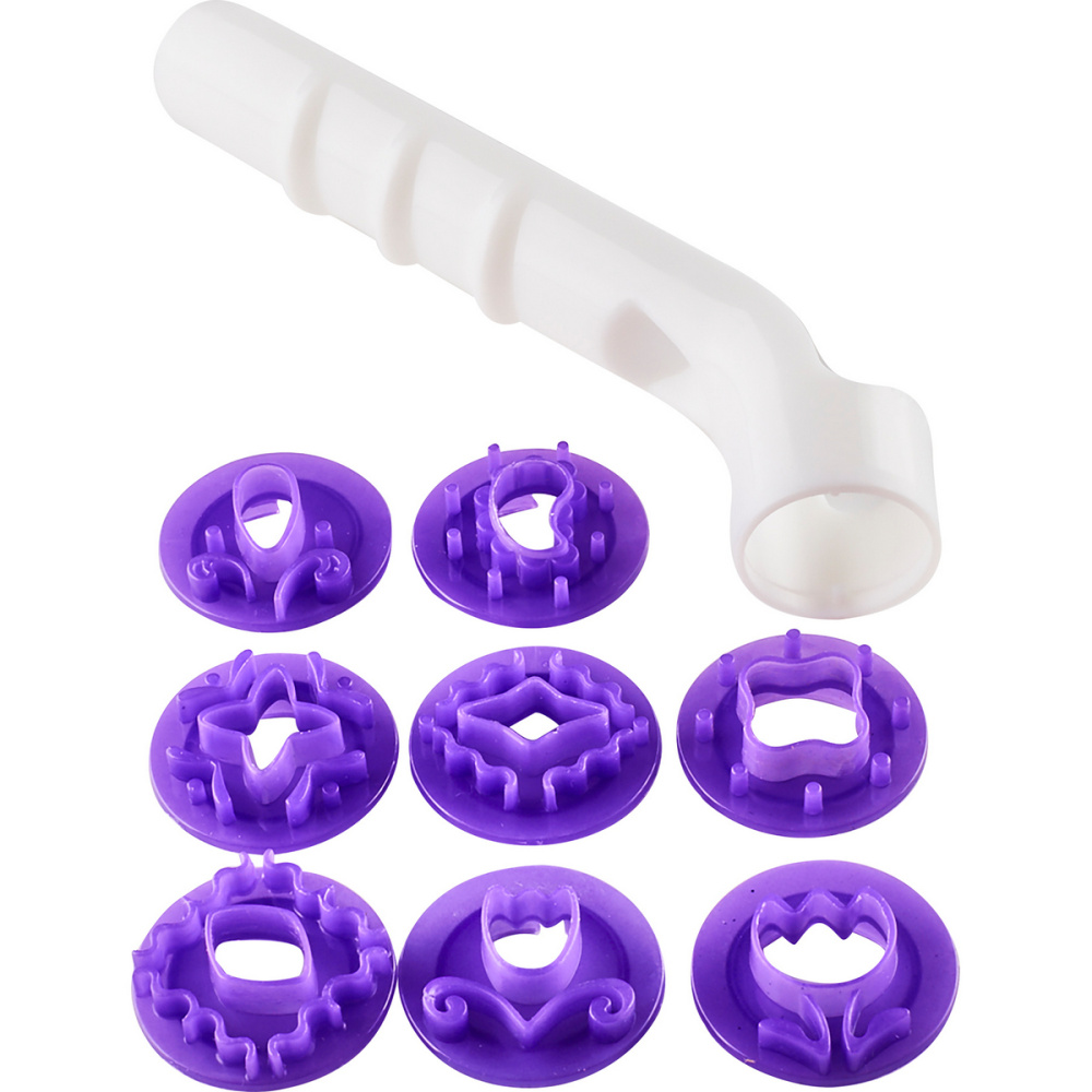 Применяется для изготовления декора из мастики и получения объёмного рисунка. В наборе 8 съёмных фигурных насадок-оттисков с размером готового рисунка: d25мм.