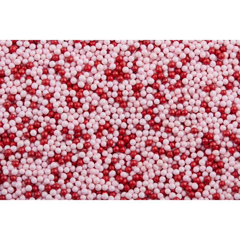 Перламутровые шарики — декор из сахара и крахмала диаметром 2 мм со специальным покрытием с эффектом перламутра. Такое покрытие делает шарики более устойчивыми к влаге и препятствует образованию ореола окрашивания на влажных поверхностях. Одно из преимуществ шариков — высокая укрывистость декорируемой поверхности, что позволяет наносить эти посыпки через трафарет для получения рисунков и надписей. Шарики подходят для декора верхней и боковой поверхности из шоколада, мастики. Используются на сливочном, масляном, творожном, белковом креме, на кондитерских глазурях, помадке, желе. Продаются в упаковке по 1 кг.