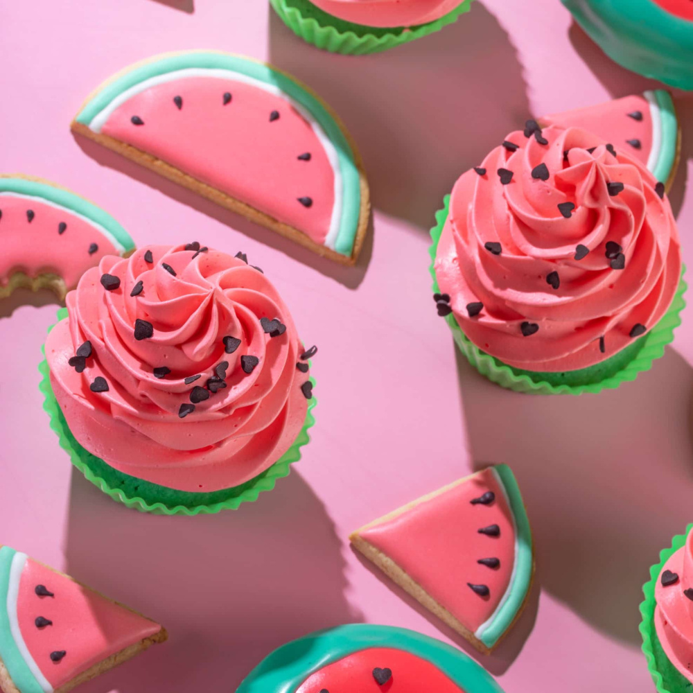 Идея декорирования "Арбузное настроение" представляет собой кексы, которые визуально напоминают сочные кусочки арбуза. Они окрашены с использованием специального арбузного красителя от компании Top-Decor, чтобы достичь идеального оттенка. Кексы также украшены сахарными посыпками в виде черных мини-сердечек, добавляя декоративный акцент и создавая атмосферу арбузного праздника. Эта идея декорирования подходит для любого сезона и мероприятия, где вы хотите подарить сладкие и привлекательные десерты с освежающим арбузным настроением.