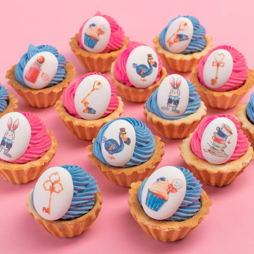Идея декорирования "Чудесные корзиночки" представляет собой корзиночки, украшенные сахарными медальонами "Алиса в стране чудес" и окрашенные пищевыми гелевыми красителями от Top Decor. На изображении видно, что корзиночки имеют яркие и красочные дизайны, которые напоминают о мире фантазии и волшебства. Сахарные медальоны "Алиса в стране чудес" становятся центральным акцентом декора, принося магию и ассоциации с известной сказкой. Окрашенные пищевыми гелевыми красителями корзиночки приобретают привлекательные оттенки, создавая визуальный интерес и подчеркивая тематику идеи. Идея декорирования "Чудесные корзиночки" идеально подходит для тематических вечеринок, детских праздников или просто для создания волшебной атмосферы на столе.