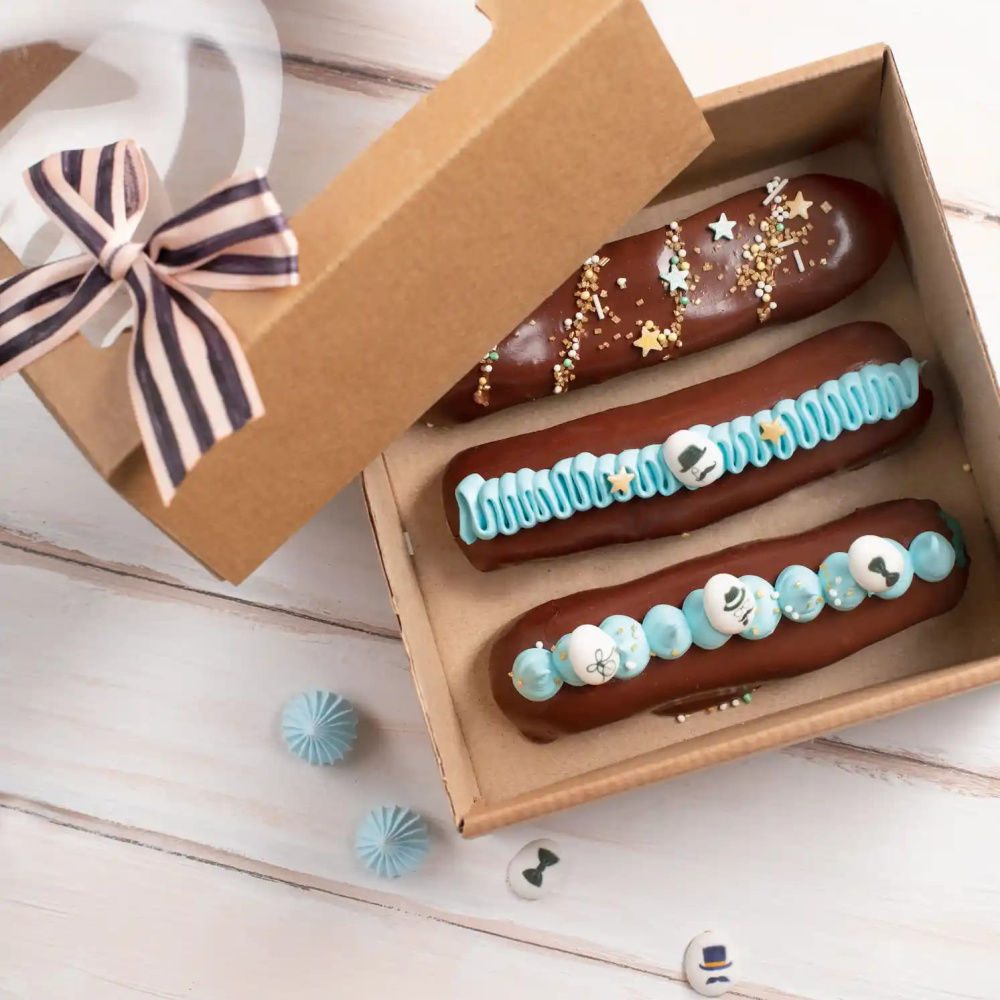 Идея "Десерт для Джентльменов" представляет изысканный десерт, который станет настоящим украшением любого стола. Эклеры, изготовленные из нежного теста, покрыты сахарной помадкой с какао от компании Top Decor, которая придает им уникальный вкус и аромат. Сверху каждый эклер украшен яркими посыпками и мини-медальонами "Джентльмены", что делает его еще более привлекательным и изысканным.