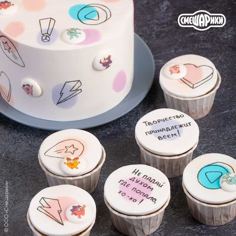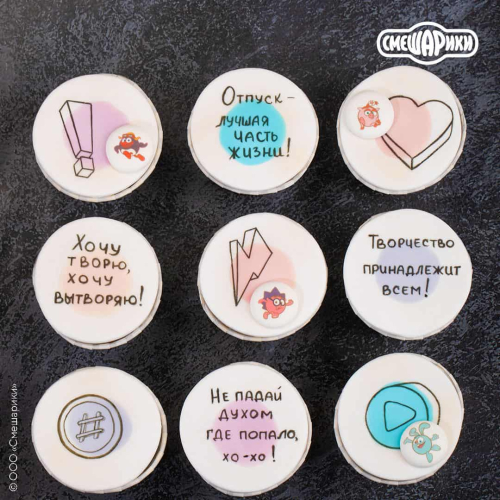 Идея декорирования "Десерты со Смешариками" представляет собой капкейки, украшенные сахарными медальонами "Смешарики Стикербомбинг" в стиле известного мультика "Смешарики". На изображении видно, что капкейки дополнительно украшены различными фразами из мультика, которые нанесены с помощью пищевых фломастеров.