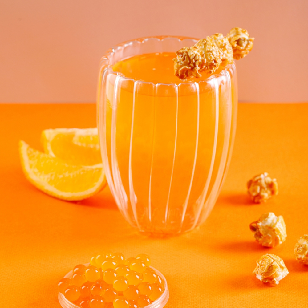 Солнечный, бодрящий, чуть сладкий — апельсин отлично раскрывается как в прохладных, так и в тёплых напитках. Добавьте шарики в чай, латте или смузи — и получите освежающую цитрусовую искру. В десертах он особенно хорошо сочетается с воздушной выпечкой и лёгкими кремами.