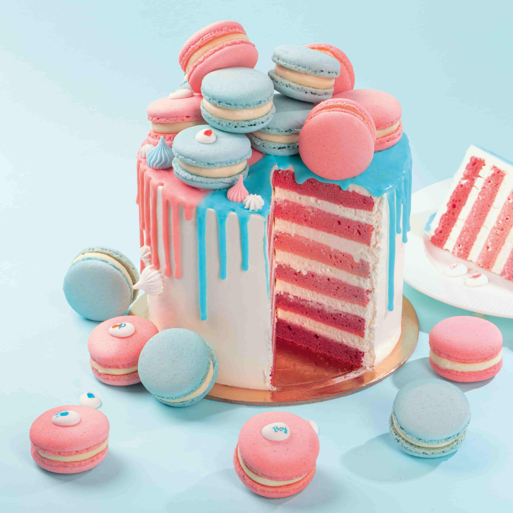 Представляем вам идею декорирования под названием "Gender party". На изображении вы можете увидеть торт и макаронс, окрашенные в яркие цвета из весенней коллекции 2022 года от Top Decor.