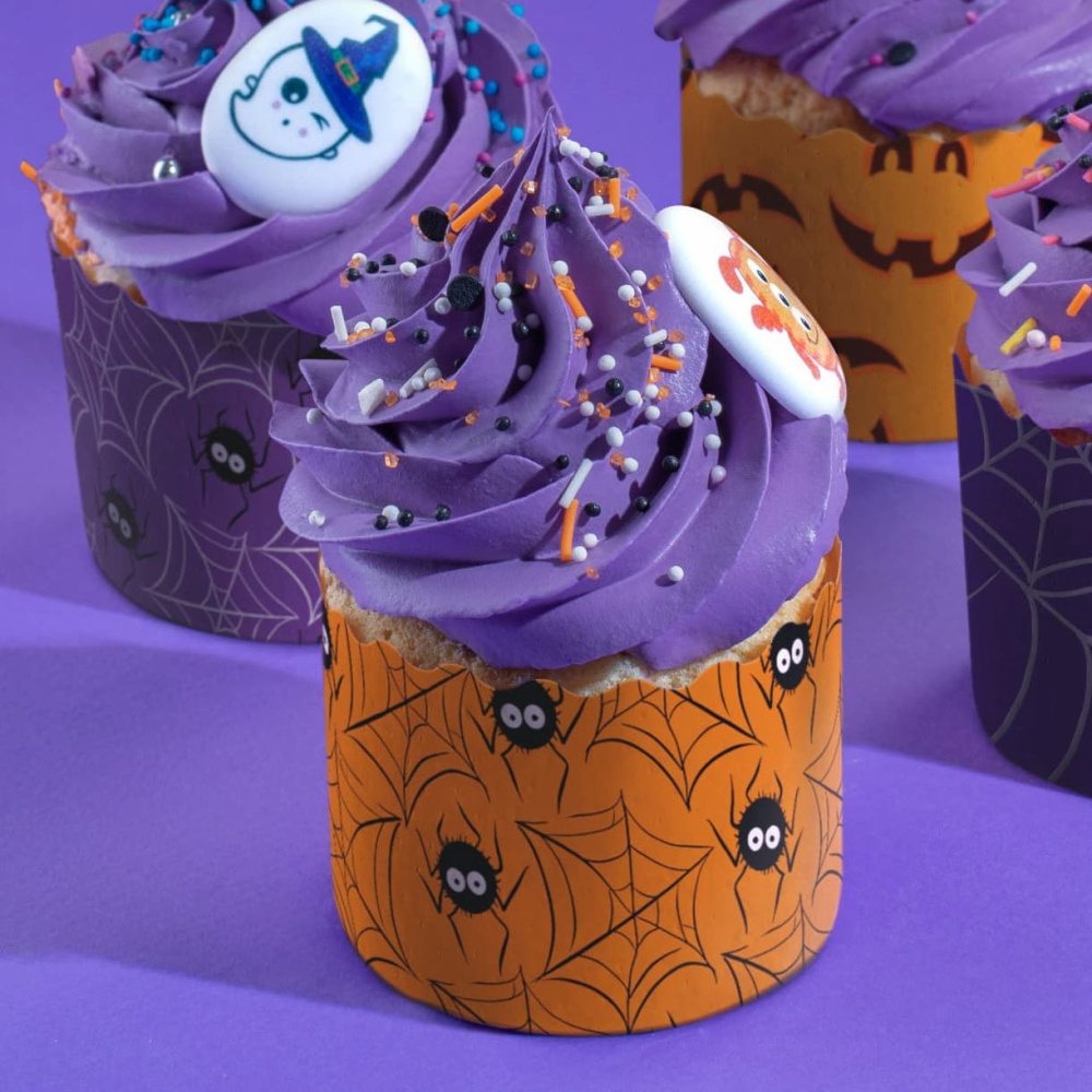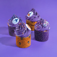 Идея декорирования "Капкейки Хэллоуин" представляет собой капкейки, испеченные в тематических бумажных формах "Хэллоуин". Верхние части капкейков окрашены ежевичным пищевым красителем от Top Decor, придавая им соответствующий цвет и атмосферу праздника. На верхушках капкейков находятся сахарные медальоны "Хэллоуин" и "Забавные монстры", а также различные посыпки от Top Decor, создающие уникальный и привлекательный внешний вид. Капкейки Хэллоуин станут ярким и вкусным украшением праздничного стола или подарком для гостей на Хэллоуинской вечеринке.