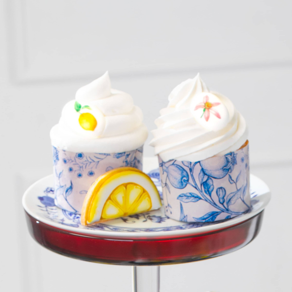 Идея декорирования "Кексы с лимонами" представляет собой кексы, испеченные в бумажных формах "Фарфор", и украшенные сахарными медальонами в форме лимонов. Такой декор придает кексам особый вид и тематическую атмосферу. Кексы с лимонами в формах "Фарфор" и медальонами "Лимоны" являются привлекательным и вкусным дополнением к столу, создавая приятное визуальное разнообразие и добавляя свежесть цитрусового вкуса.