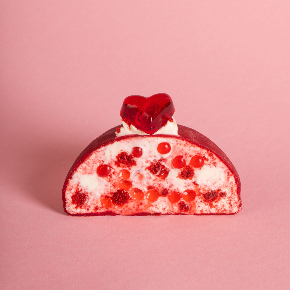 Насыщенный красный бисквит в сочетании с сочными вишнёвыми джус бабл создаёт эффектный акцент и раскрывает десерт с новой стороны. Эластичное рисовое тесто мягко обрамляет начинку, делая каждый кусочек выразительным и запоминающимся.