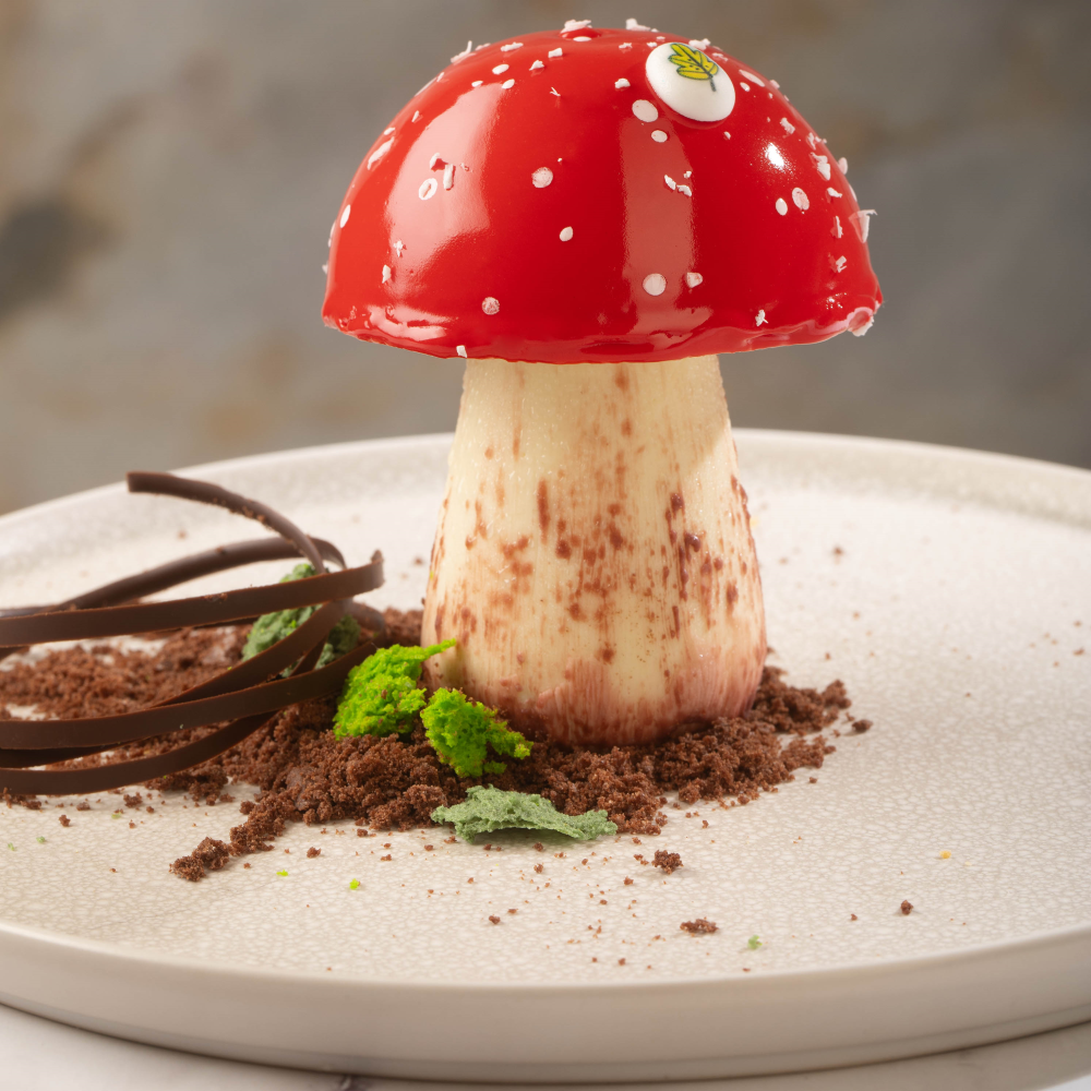 Изящный муссовый десерт в виде лесного гриба украсит любую кондитерскую витрину и праздничный стол, придав гостям атмосферу осенней поры.
