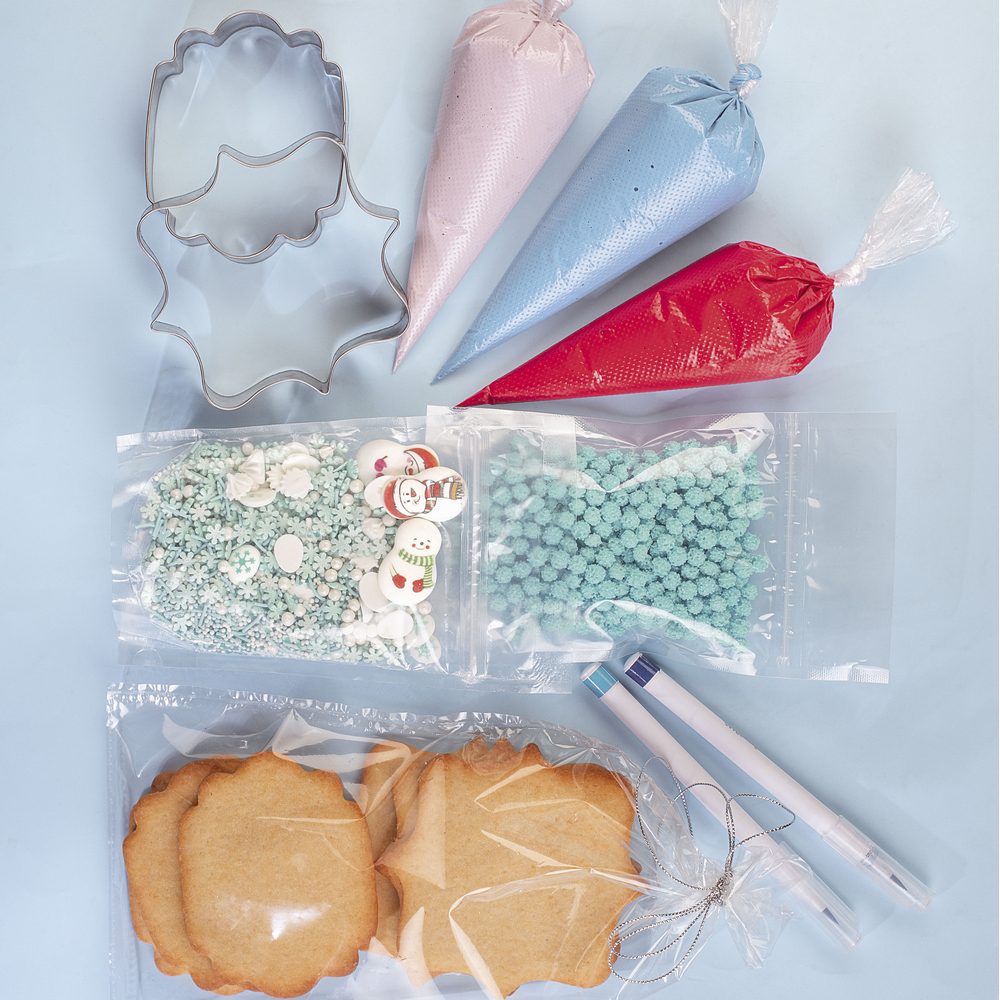 В состав набора входят пряники, приготовленные из ароматной имбирной смеси для пряников Top decor, корнеры с айсингом, окрашенные гелевыми водорастворимыми красителями в зимних оттенках, 2 пищевых фломастеры, посыпки “голубые помпоны” и сложный микс посыпок “Снежные забавы”.