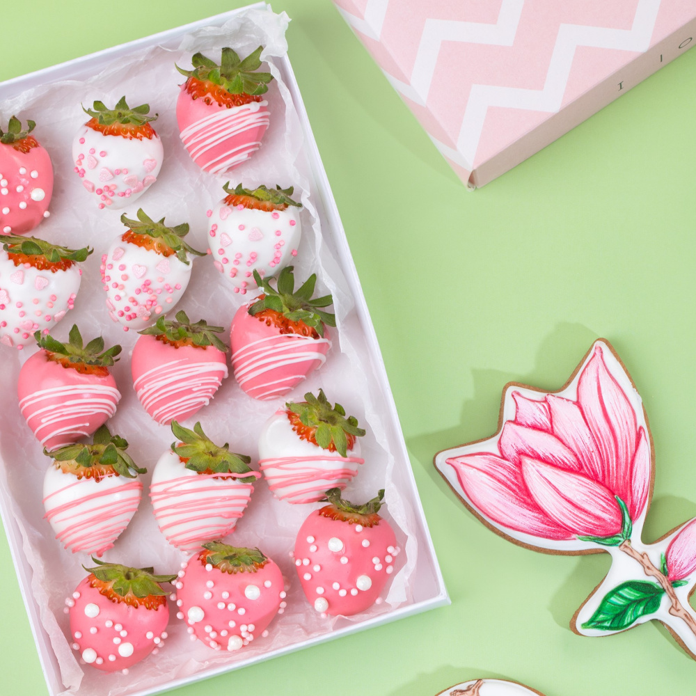 Идея “нежная клубника” поможет вам без слов выразить свою любовь и благодарность близкому человеку на весенних праздниках. На изображении представлена сочная клубника задекорированная в весенних оттенках.