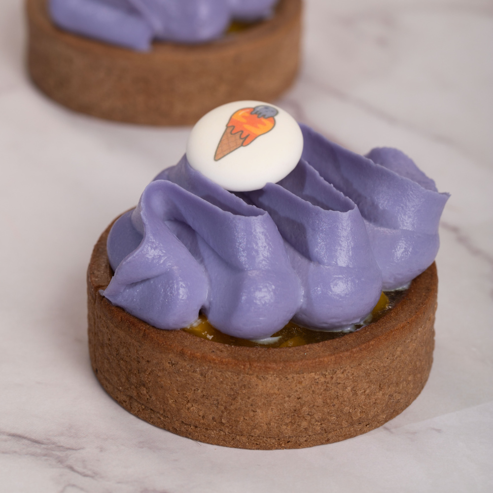Дополните этот нежный десерт кремом, который придаст ему еще больше изыска. Мы рекомендуем использовать наш летний пищевой краситель "Фиолетовый" и украсить десерт готовым сахарным медальоном "Время приключений". Это добавит десерту элегантности и уникальности.
