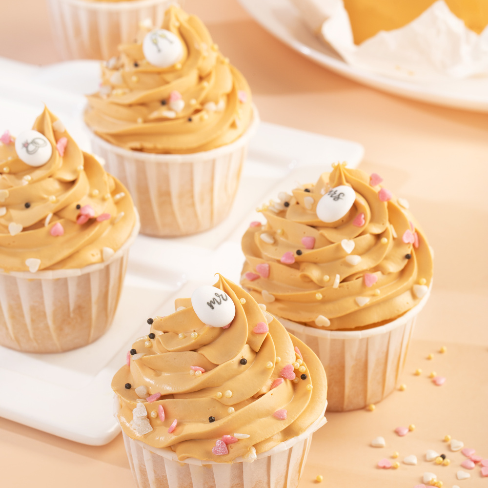 Для окрашивания десертов в нежный цвет крем-брюле мы использовали гелевый водорастворимый краситель в оттенке: “крем-брюле”. Украшены десерты сахарными медальонами “Свадьба, посыпками в виде белых и черных шариков, а также розовыми и белыми перламутровыми сердечками.