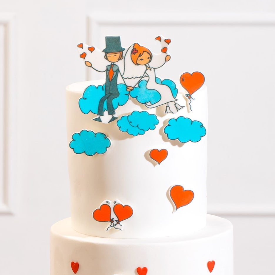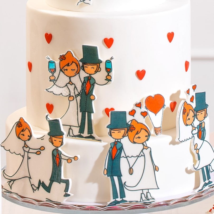 Идея декорирования "Торт к свадьбе" представляет собой обтянутый белой мастикой торт, который станет изысканным и элегантным украшением вашего свадебного стола. На поверхности торта размещены вафельные картинки с изображением влюбленной пары, создающие атмосферу любви и романтики. Дополнительным акцентом является посыпка с крупными сердцами от компании Top Decor, которая добавляет шарма и символизирует важность и счастье этого особого дня.