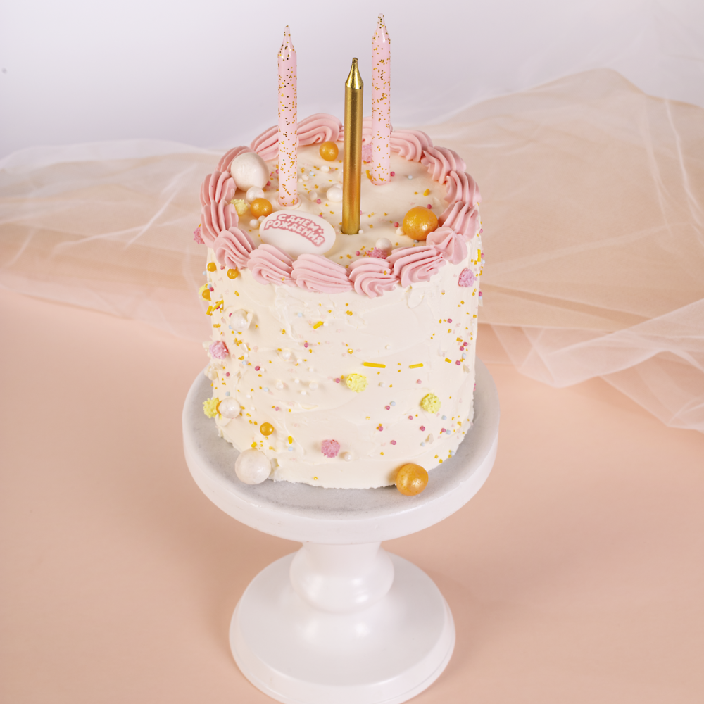 Изысканный бело-розовый торт, словно созданный для самых тёплых и ярких моментов лета. Нежные оттенки словно переливаются на солнце, а поверхность украшена воздушным жемчужным миксом посыпок с акцентами благородного золотого цвета.