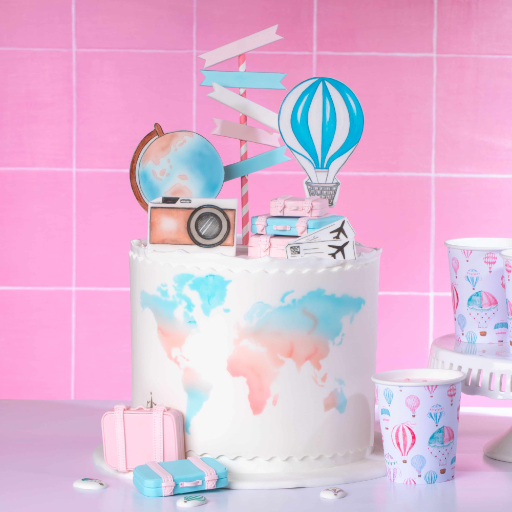 Для тех, кто ищет идеи для торта на тему путешествий, наша компания Top Decor предлагает идею декорирования "Воздушные шары". На изображении к идее вы можете увидеть торт в белых тонах, украшенный разнообразными элементами из мастики, создающими атмосферу путешествия. На верхушке торта мы использовали декор в виде воздушного шара, который может стать не только интересным элементом декора, но и символом приключений. Кроме того, мы добавили глобус, фотоаппарат и другие предметы, которые будут прекрасным дополнением к тематике путешествий.