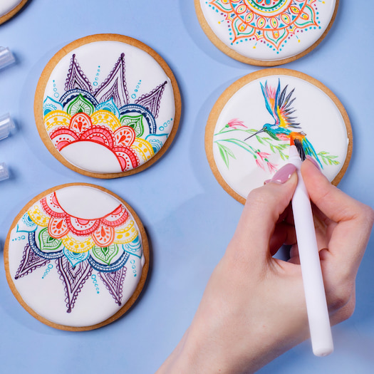 Идея декорирования "Яркие узоры" представляет собой пряники, украшенные яркими и запоминающимися узорами. На изображении к идее видно, как каждый пряник оживает благодаря разнообразным узорам, созданным с использованием пищевых фломастеров Top Decor.