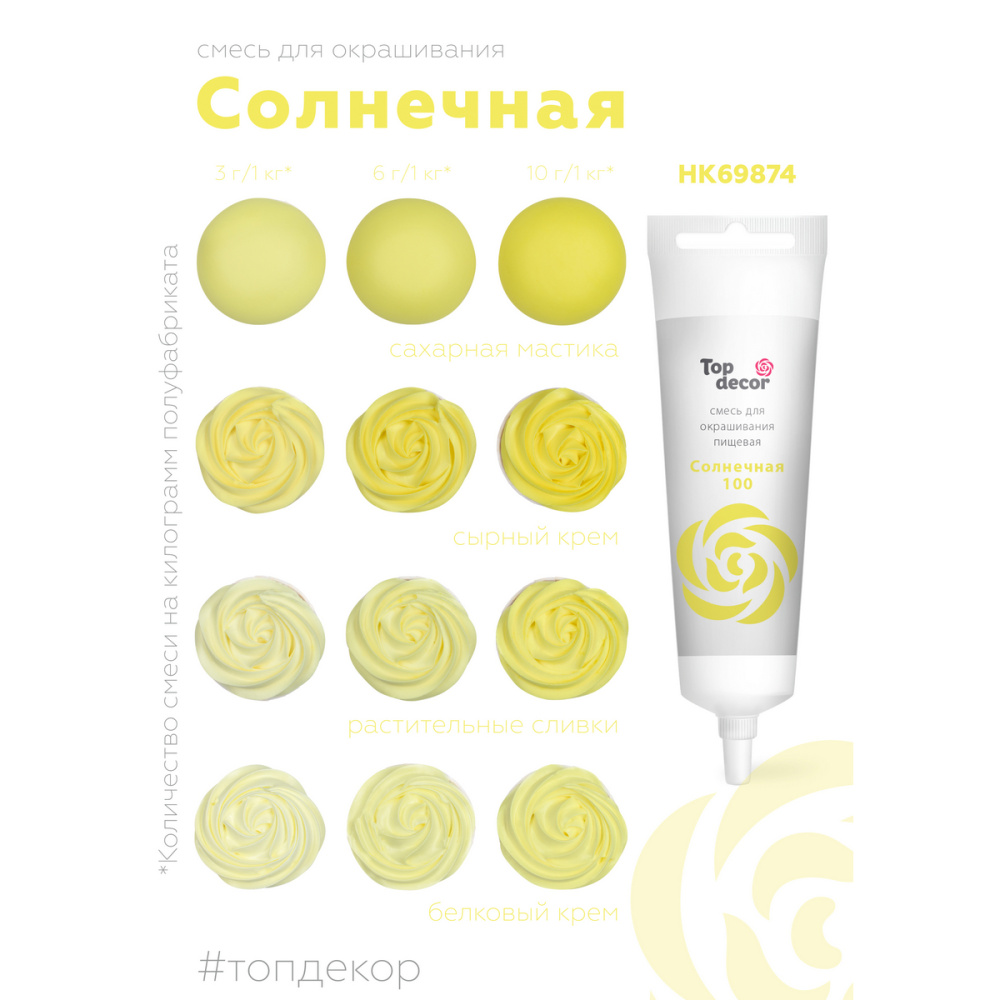 Краситель водорастворимый с высокой концентрацией красящего пигмента. Густая консистенция позволяет ему хорошо окрашивать по всей массе основные кондитерские полуфабрикаты (желе, мусс, крем, тесто, мастика и другие), не изменяя их консистенцию. Не имеет вкуса и аромата, благодаря чему сохраняет первоначальные вкусовые свойства окрашиваемого продукта. Рекомендуемая дозировка: 2-3 капли (0,1-0,15 г) на 100 грамм окрашиваемой массы. Продаётся в тюбике по 100 грамм. Способ применения: перед применением проколите пломбу тюбика, срезать не рекомендуется.