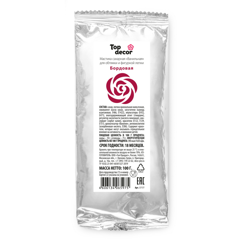 Сахарная мастика с тонким ароматом ванили — уникальный кондитерский полуфабрикат для декорирования изделий. Создана на основе эквивалента какао-масла, благодаря чему является универсальной массой для обтяжки тортов, фигурной лепки, а также для создания тонких элементов декора. Мастика легко окрашивается любыми пищевыми красителями, для создания перламутрового эффекта рекомендуется использовать сухой блестящий краситель. Ассортиментная линейка мастики представлена самыми актуальными оттенками, которые идеально смешиваются друг с другом, расширяя цветовую палитру для вашего творчества. Продаётся в фольгированных пакетах по 100 грамм. Способ применения: разогреть в руках необходимое количество мастики, размять на сухой, слегка подпыленной крахмалом поверхности (во избежание прилипания) до мягкой пластичной консистенции. По желанию добавить краситель или смешать с мастикой другого цвета, использовать для декорирования или лепки. Рекомендации по применению мастики для покрытия тортов: поверхность стола предварител