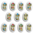Состав: сахар, патока крахмальная, сухой яичный белок, загустители (Е466,Е1422),желатин, регулятор кислотности (к-та лимонная), красители пищевые (в ассортименте)