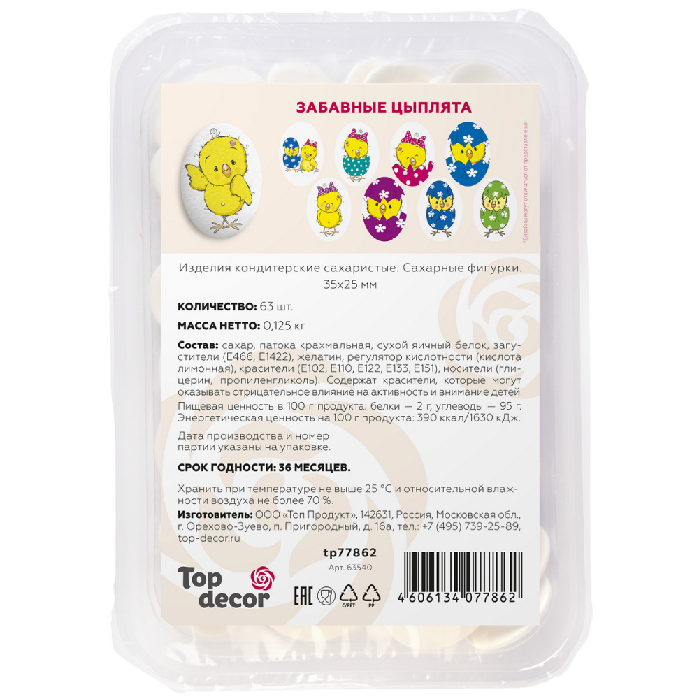 Состав: сахар, патока крахмальная, сухой яичный белок, загустители (Е466,Е1422),желатин, регулятор кислотности (к-та лимонная), красители пищевые (в ассортименте)
