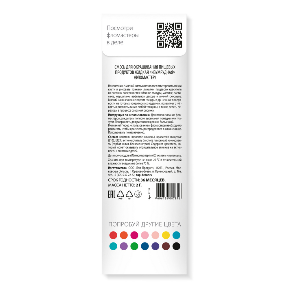Состав продукта: Носитель (пропиленгликоль), красители пищевые (Е102,Е133), антиокислитель (кислота лимонная), консерванты (сорбат калия, бензат натрия).