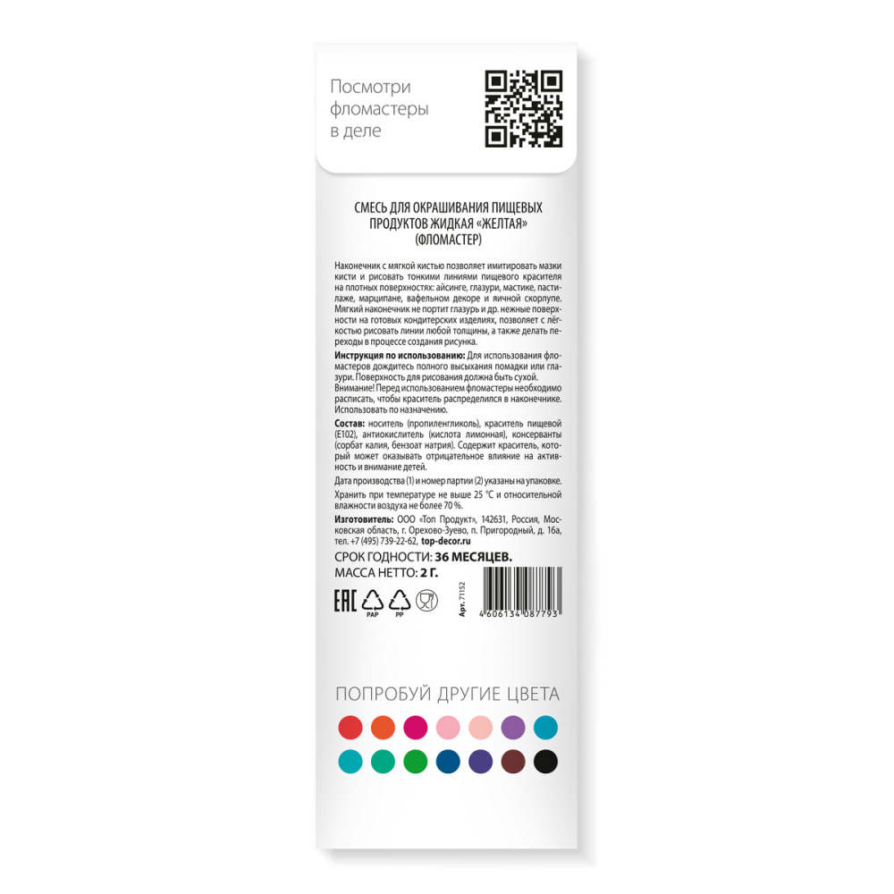 Состав продукта: Носитель (пропиленгликоль), красители пищевые (Е102), антиокислитель (кислота лимонная), консерванты (сорбат калия, бензат натрия).