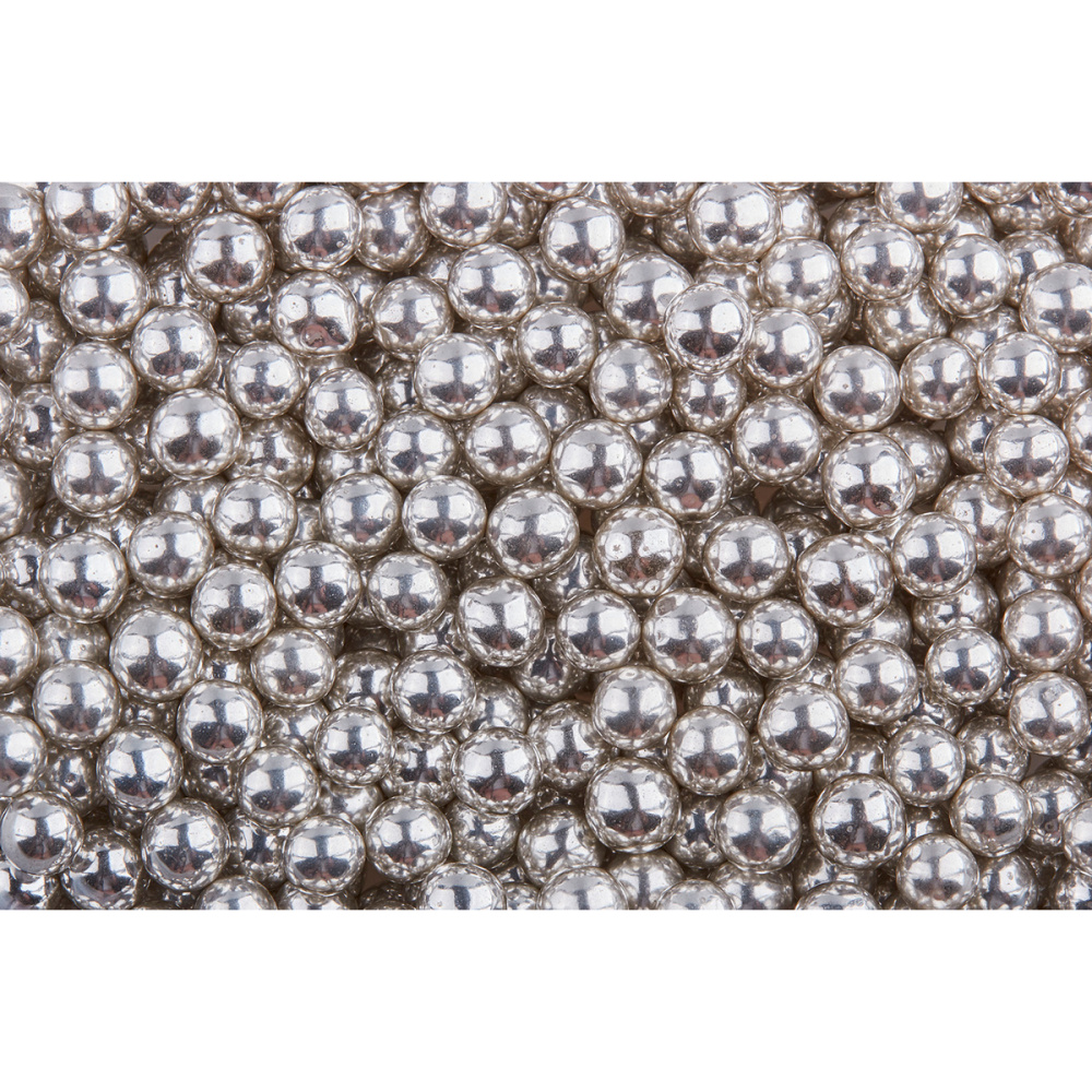 Шарики из сахара и крахмала диаметром 6 мм, покрытые пищевым серебром. Самостоятельный декор, в основном используется поштучно или как часть микса посыпок. Продаются в упаковке по 1 кг.