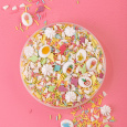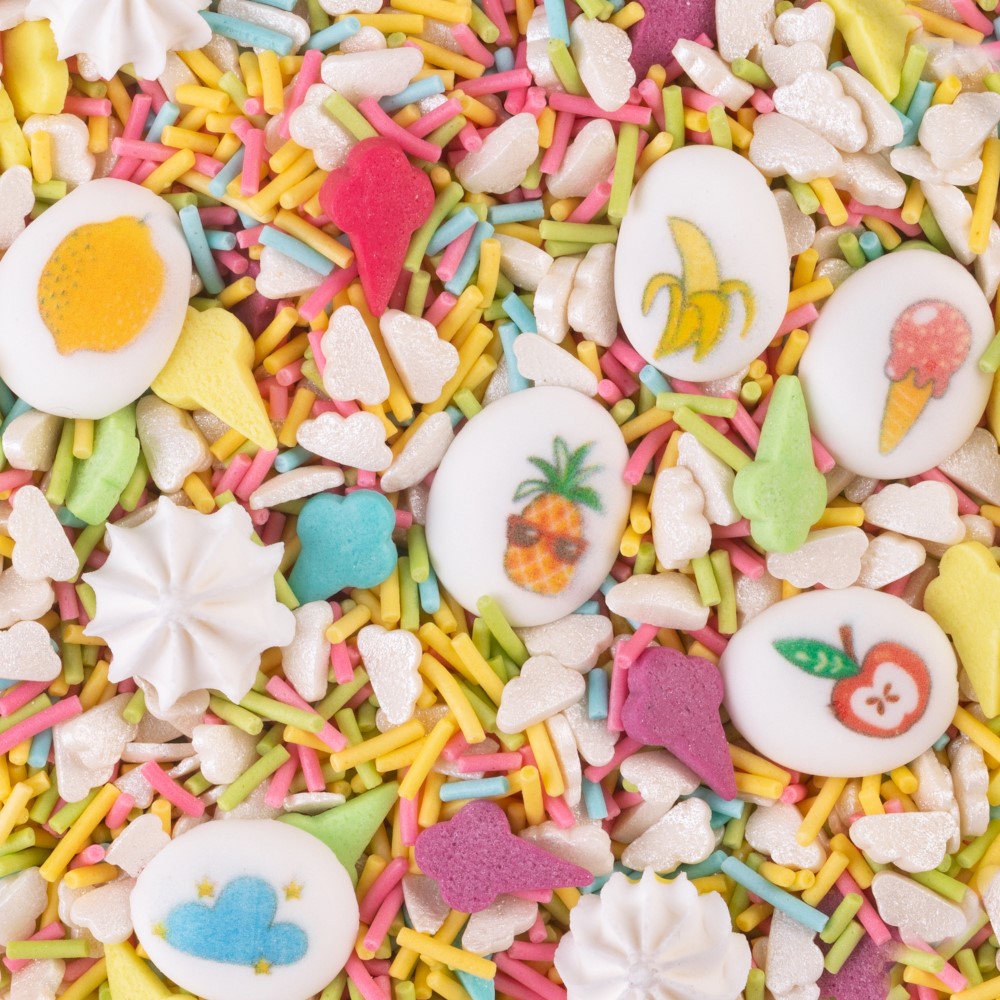 Состав продукта: Сахар, мука рисовая, крахмал кукурузный, мука пшеничная, масло растительное, носители (Е1422, глицерин, пропиленгликоль), декстроза, сухой яичный белок, глазирователи (шеллак, карнаубский воск), патока, эмульгаторы (лецитин рапсовый, целлюлоза микрокристолическая, Е473, Е432), загустители (камедь целлюлозы, Е1400, камедь ксантановая), антислеживающий агент (Е554), красители (Е102,Е104,Е110,Е120,Е122,Е124,Е129,Е133,Е151,Е171,Е172),желатин,ароматизатор Ванилин, антиокислители (аскорбиновая кислота, Е306) регуляторы кислотности (кислота лимонная, Е331III). Содержат красители, которые могут оказывать отрицательное влияние на активность и внимание детей