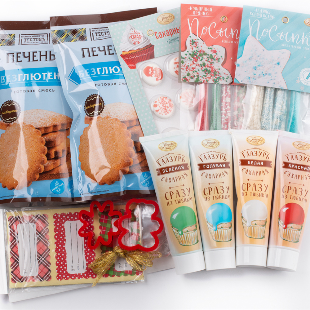 Состав продукта: Состав набора: смесь для приготовления имбирного печенья безглютеновая - 400 г (2 шт. по 200 г), посыпки кондитерские декоративные "Ледяное королевство" - 20 г, "Имбирный пряник" - 20 г, глазурь сахарная (белая - 120 г., зелёная - 120 г., красная - 120 г., голубая - 120 г.), сахарные фигурки <Крисмас>- 12 г. формы для вырубки печенья - 2 шт., пергамент для выпечки - 1 шт., наклейки для подарков - 1 шт., ленточка - 1 шт., пакеты - 15 шт.