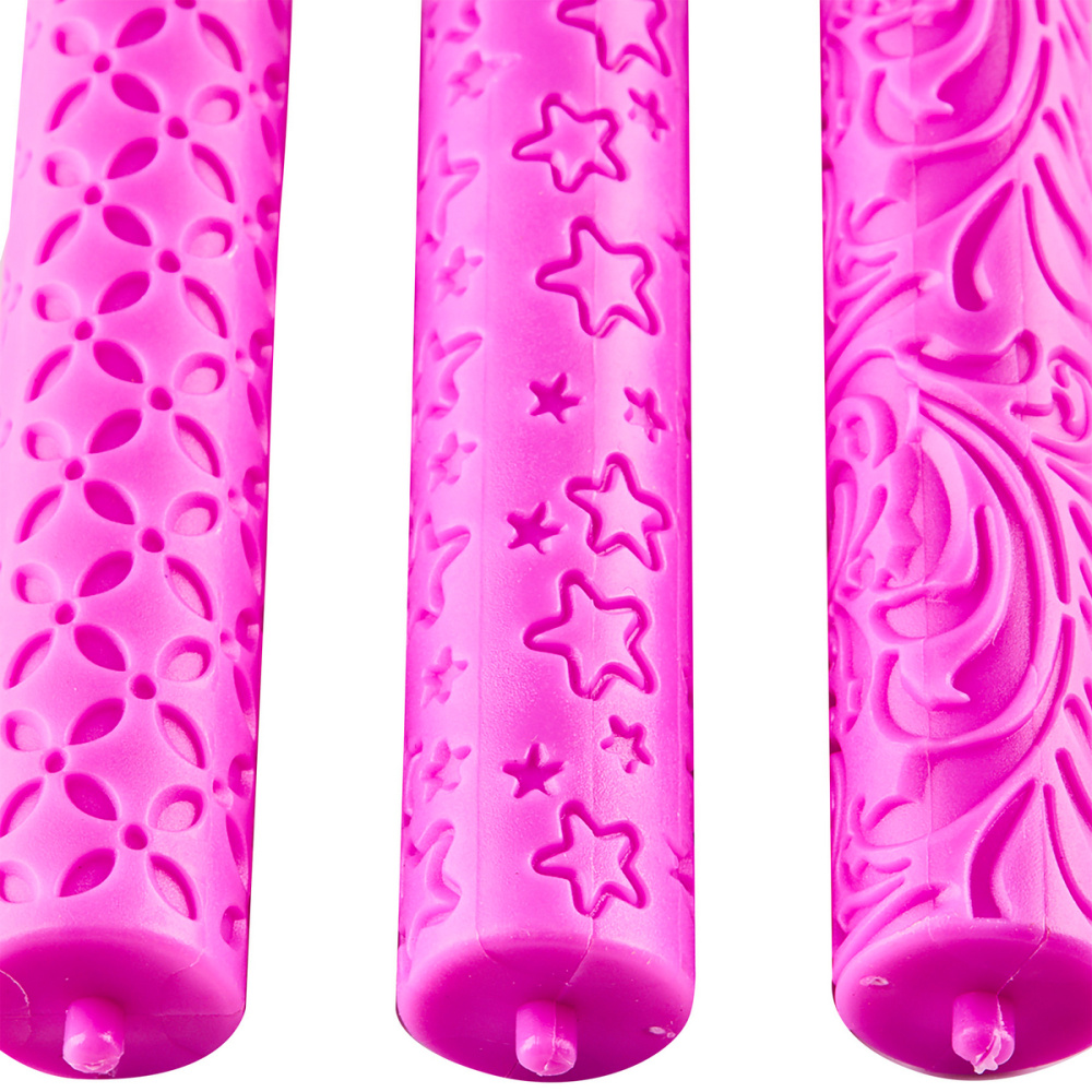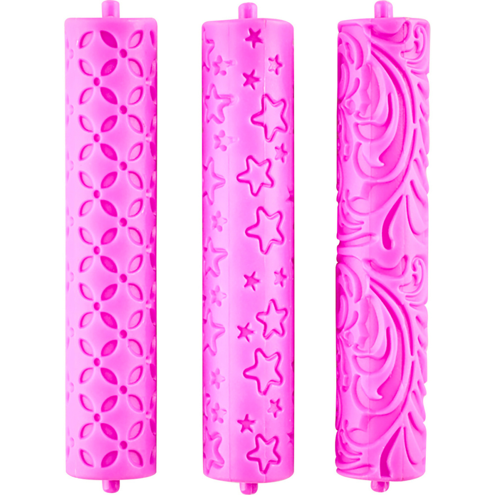 Скалка с узором предназначена для нанесения объёмного рисунка на полотно из мастики и последующей обтяжки торта, украшения капкейков и прочих кондитерских изделий. В наборе 3 мини-скалочки размером d20x100мм.