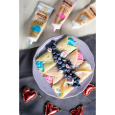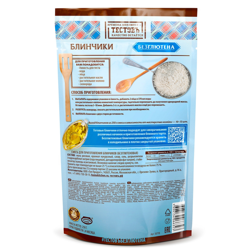 Состав продукта: мука рисовая, крахмал кукурузный, сахар, соль, разрыхлители (E450i, Е500ii), стабилизатор (камедь ксантановая). Возможно наличие следов яичных продуктов, кунжута, орехов, сои.