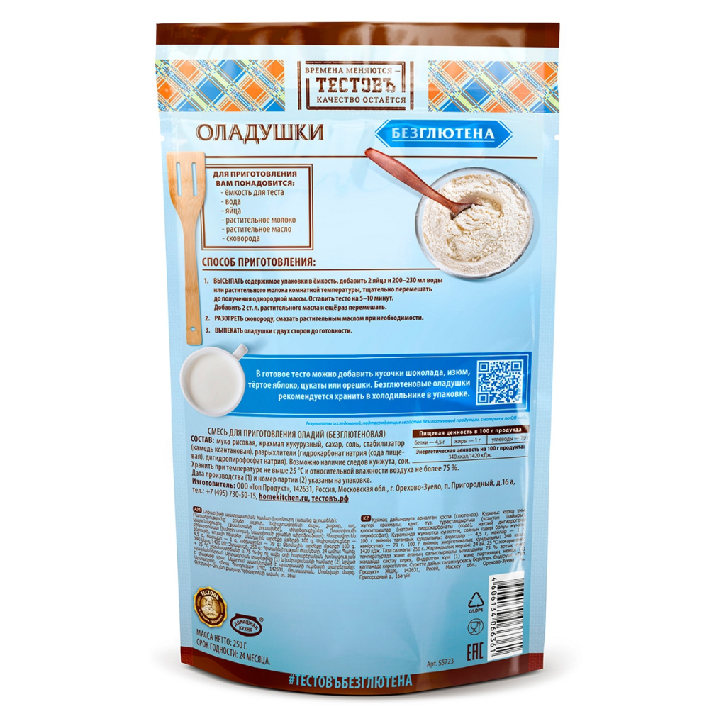 Состав продукта: мука рисовая, крахмал кукурузный, сахар, соль, стабилизатор (камедь ксантановая), разрыхлители (Е450i, E500i). Возможно наличие следов яичных продуктов, кунжута, орехов, сои.