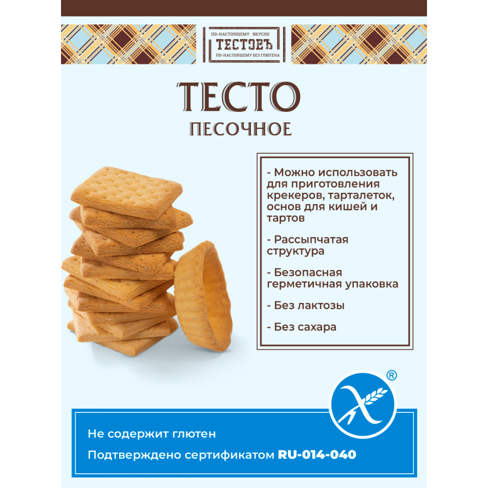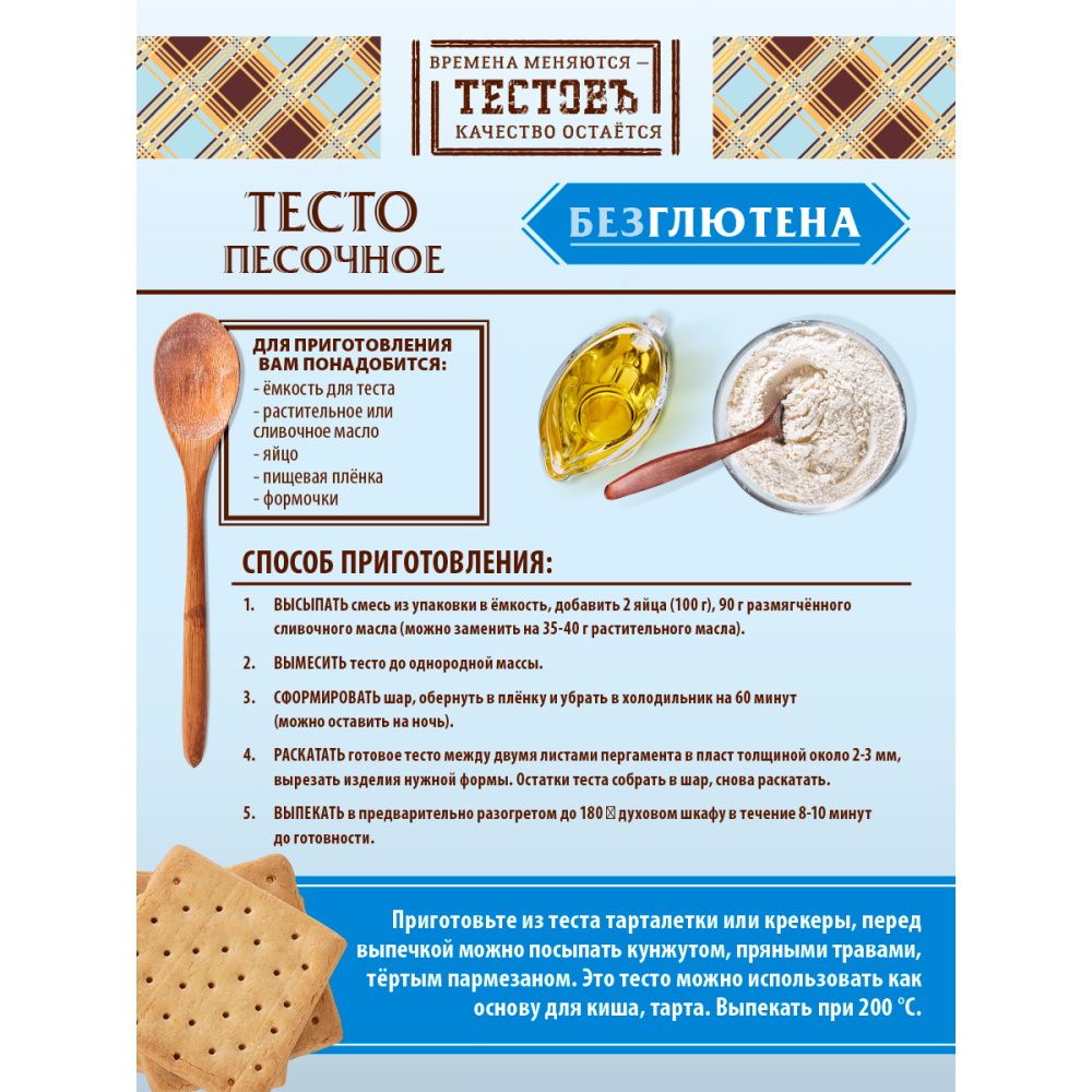 БЕЗГЛЮТЕНОВЫЕ смеси Тестовъ разработы специально для тех, кто по тем или иным причинам решил отказаться от глютена в рационе.Смеси изготавливаются на обособленном производстве, где полностью исключен контакт с пшеничной мукой, а готовая выпечка не уступает по вкусу традиционной на пшеничной муке. Вы никогда бы не подумали, что песочное тесто может быть таким рассыпчатым!