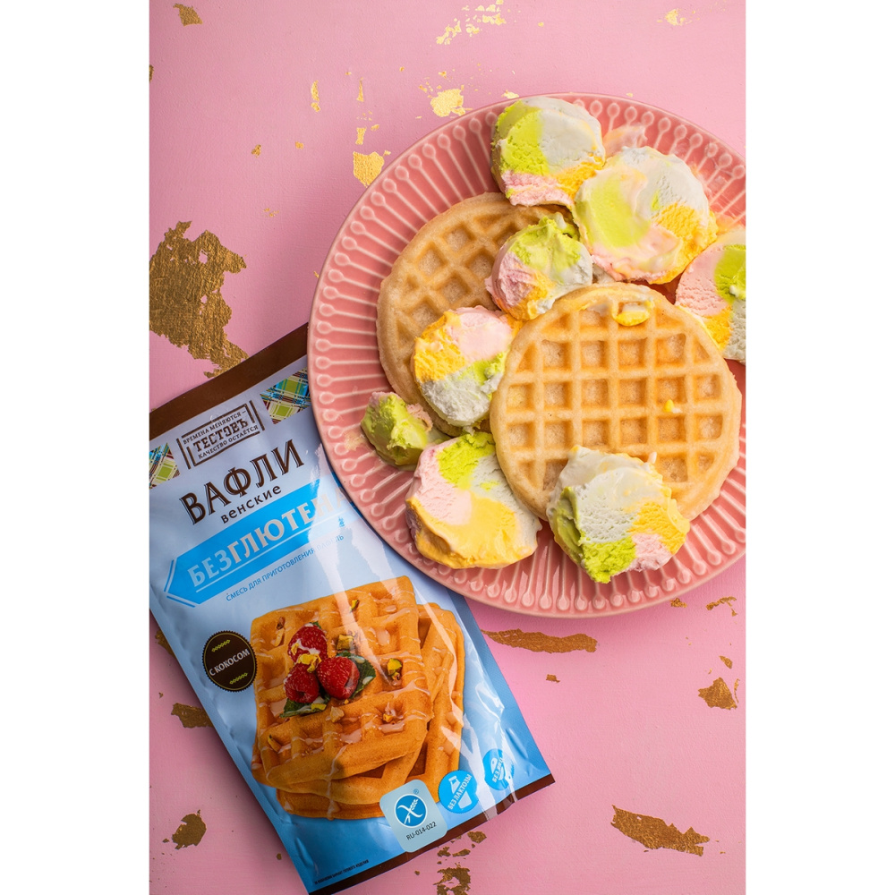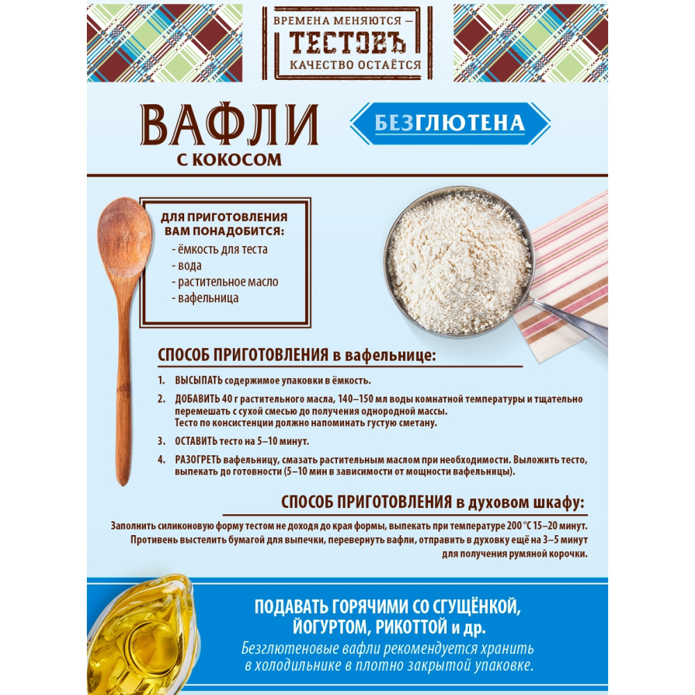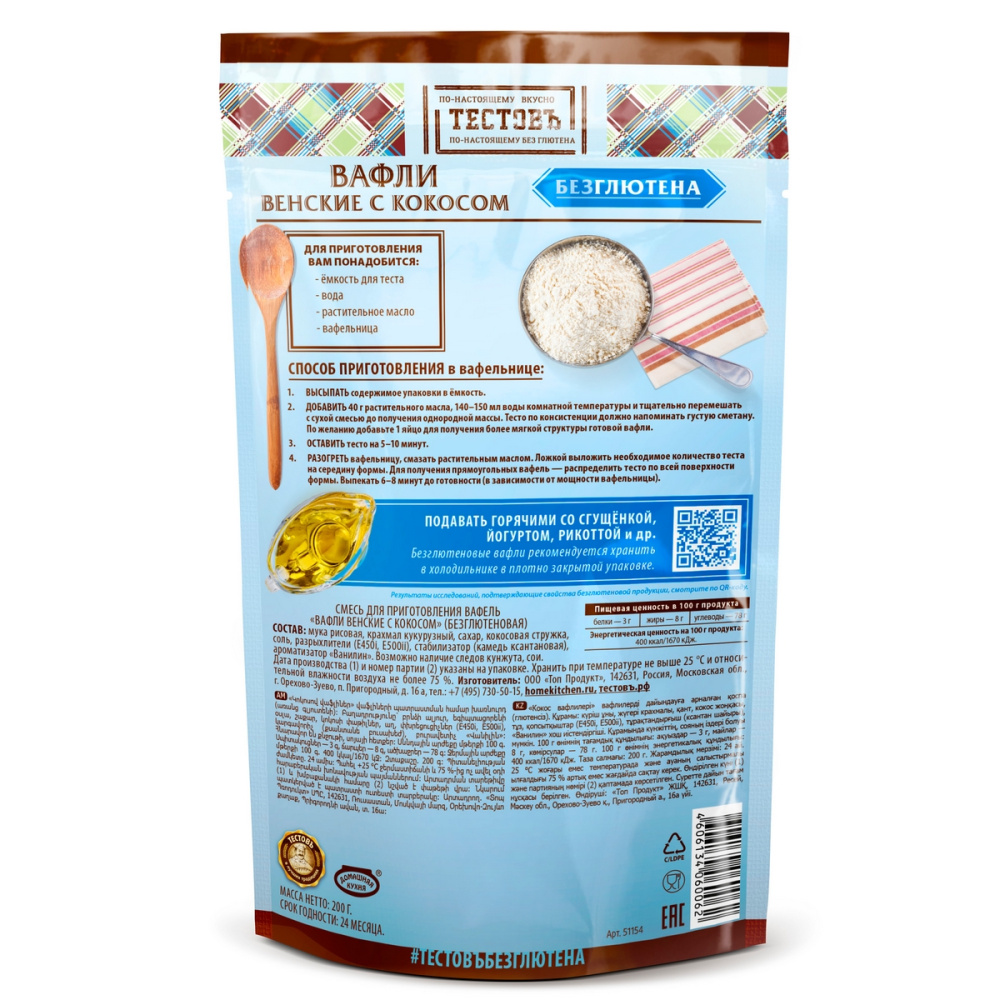 Состав продукта: мука рисовая, крахмал кукурузный, сахар, кокосовая стружка, соль, разрыхлитель (Е500ii), стабилизаторы (Е450i, камедь ксантановая), ароматизатор "Ванилин". Возможно наличие следов кунжута, сои.