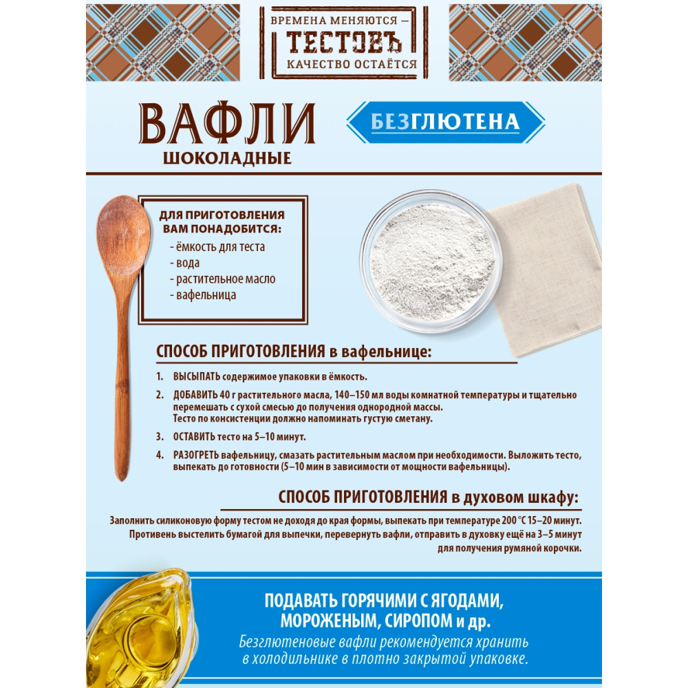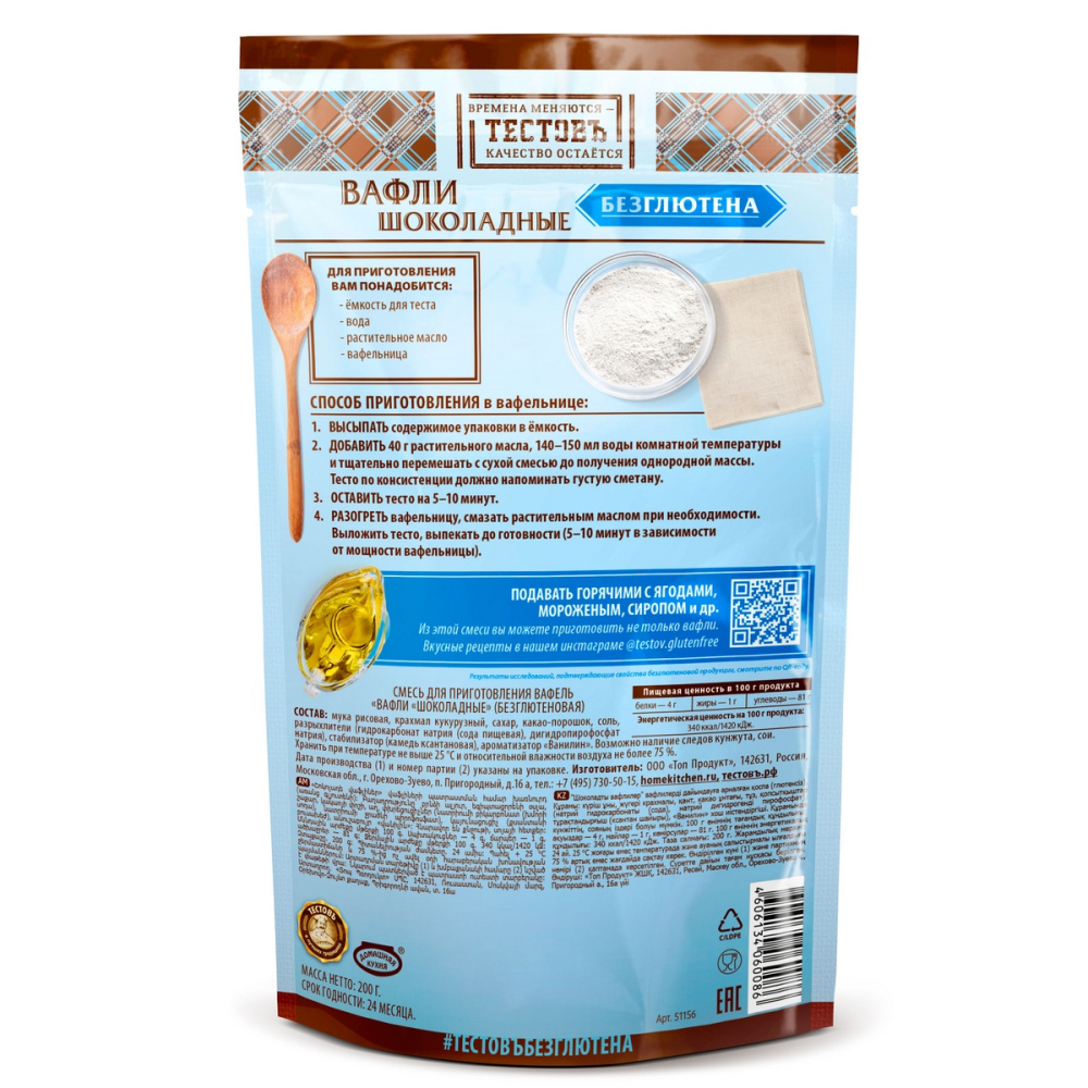 Состав продукта: мука рисовая, крахмал кукурузный, сахар, какао-порошок, соль, разрыхлители (гидрокарбонат натрия (сода пищевая), дигидропирофосфат натрия), стабилизатор (камедь ксантановая), ароматизатор "Ванилин". Возможно наличие следов кунжута, сои.