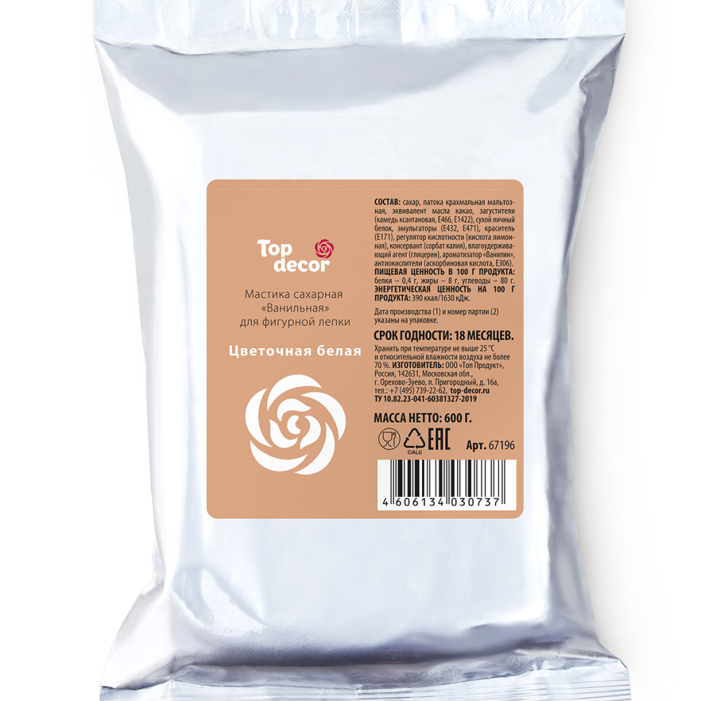 Состав продукта: Сахар, патока крахмальная мальтозная, эквивалент масла какао, загустители (E415, E466, E1422), сухой яичный белок, эмульгаторы (E432, E471), краситель (E171), регулятор кислотности (Е330), консервант (E202), влагоудерживающий агент (E422), ароматизатор "Ванилин", антиокислители (Е300, Е306).