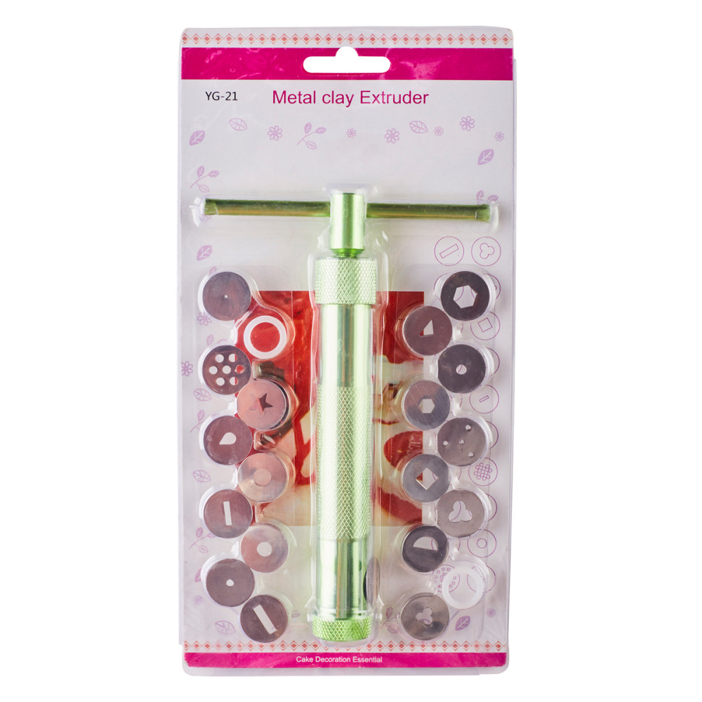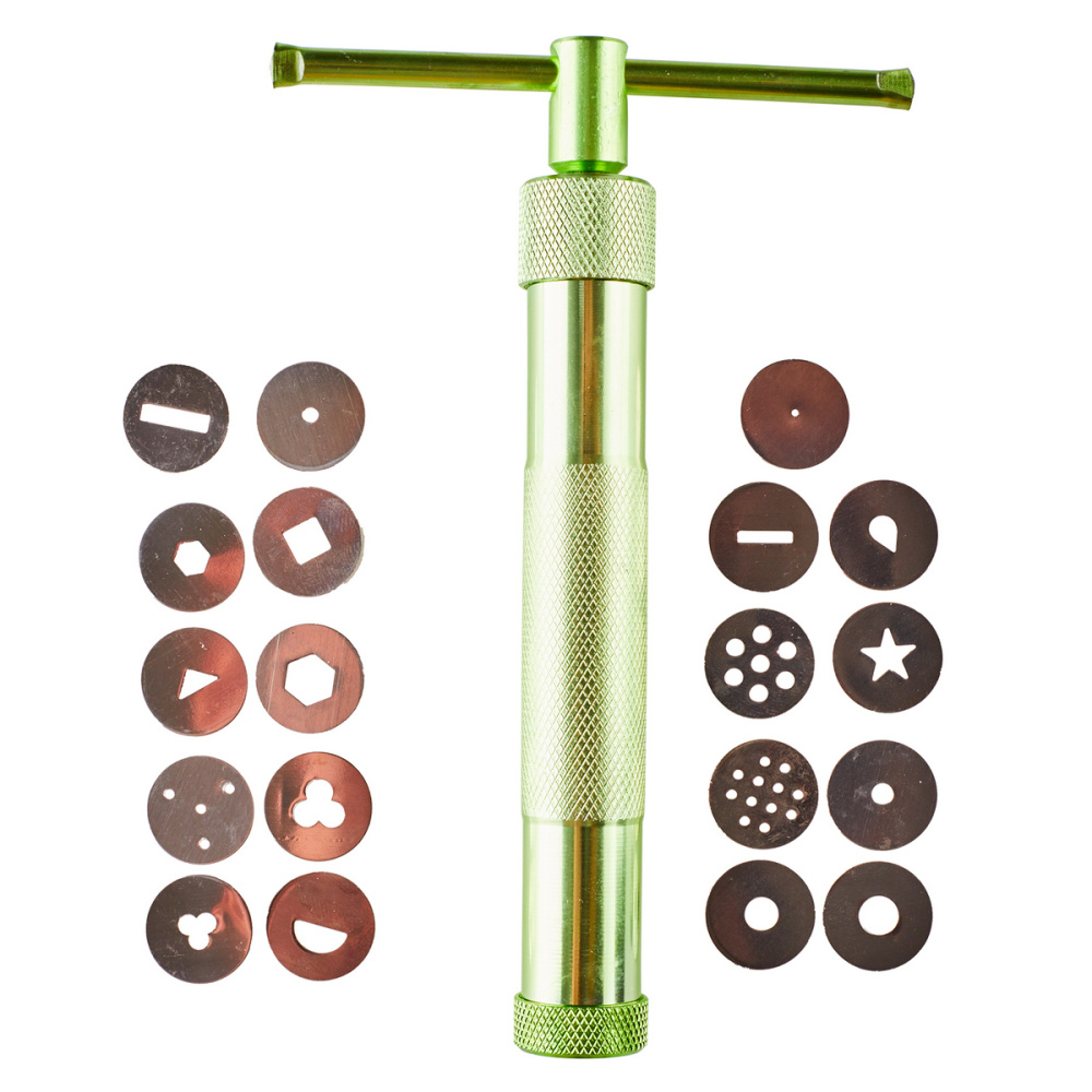 Экструдер для мастики позволяет изготавливать различные изделия и заготовки из мастики. Сахарная мастика предварительно загружается в экструдер и под давлением через выбранную насадку создаётся заготовка определённой формы и размера. В комплекте - 20 насадок.