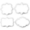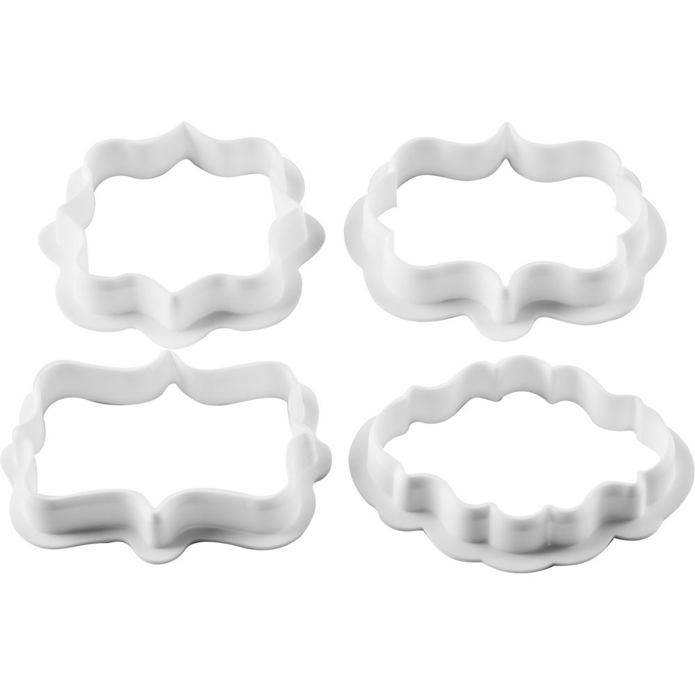 Вырубки предназначены для изготовления декора из сахарной мастики и марципана, позволяют быстро украсить любое кондитерское изделие. При работе с сахарной мастикой рекомендуется использовать крахмал или мелкодисперсную сахарную пудру во избежание прилипания массы к вырубке. Способ применения: раскатайте сахарную мастику в пласт нужной толщины, вырежьте заготовку вырубкой. В наборе 4 вырубки с размером готовых изделий: 62x62мм, 72x60мм, 72x50мм, 72x50мм.