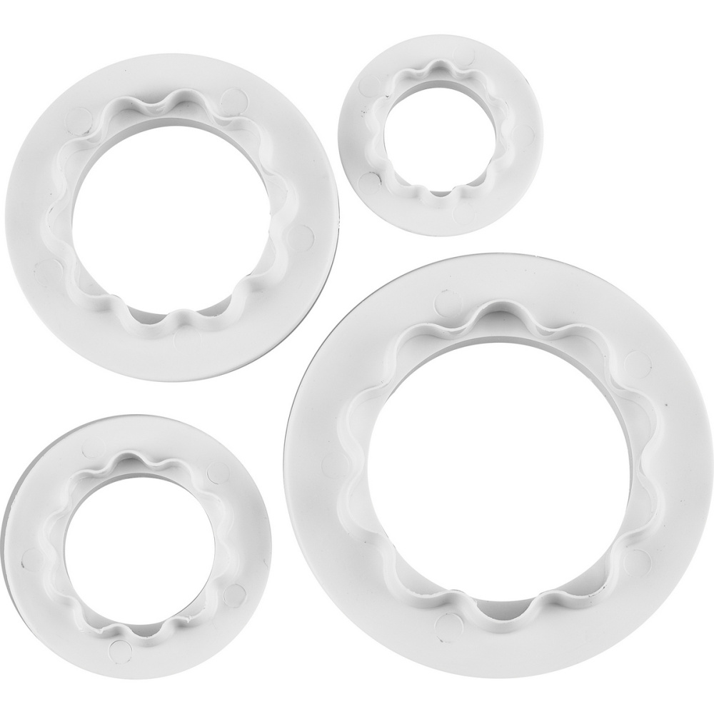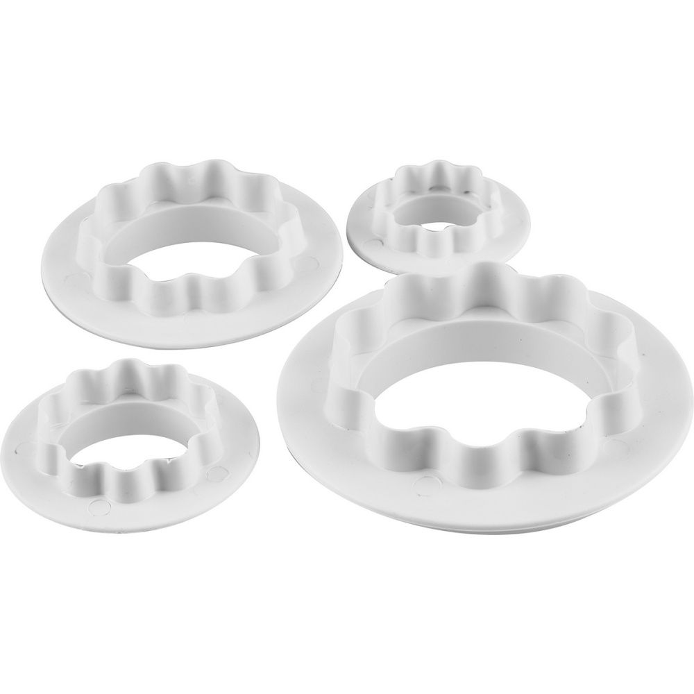 Вырубки предназначены для изготовления декора из сахарной мастики и марципана, позволяют быстро украсить любое кондитерское изделие. При работе с сахарной мастикой рекомендуется использовать крахмал или мелкодисперсную сахарную пудру во избежание прилипания массы к вырубке. Способ применения: раскатайте сахарную мастику в пласт нужной толщины, вырежьте заготовку вырубкой. В наборе 4 двухсторонних вырубки с размером готового изделия: рифлёный круг - d29мм, d39мм, d50мм, d65мм; гладкий круг - d24мм, d32мм, d42мм, d56мм.
