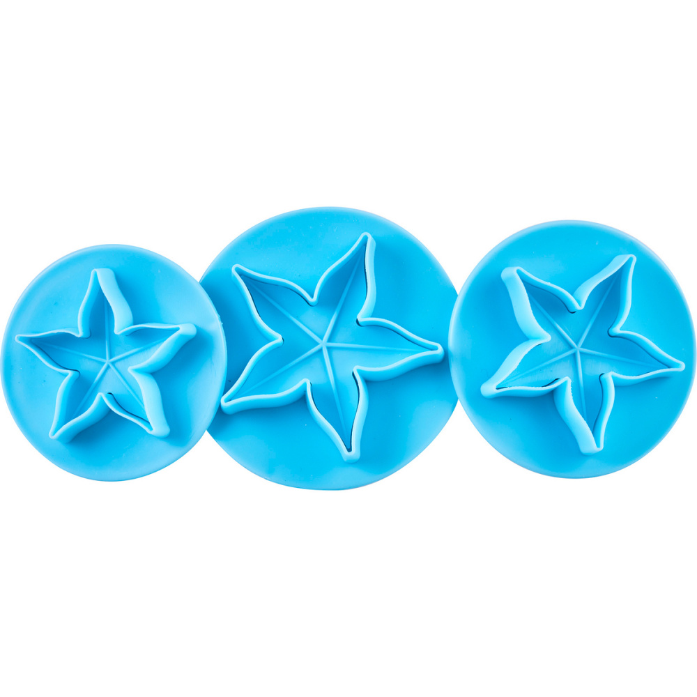 Вырубки предназначены для изготовления декора из сахарной мастики и марципана, позволяют быстро украсить любое кондитерское изделие. При работе с сахарной мастикой рекомендуется использовать крахмал или мелкодисперсную сахарную пудру во избежание прилипания массы к вырубке. Способ применения: раскатайте сахарную мастику в пласт нужной толщины, вырежьте заготовку вырубкой, не нажимая на выталкиватель, перенесите заготовку на мягкий коврик. Вытолкните заготовку, нажимая на выталкиватель, тем самым придавая заготовке рельеф. В наборе 3 вырубки с размером готовых изделий: 40мм, 50мм, 60мм.