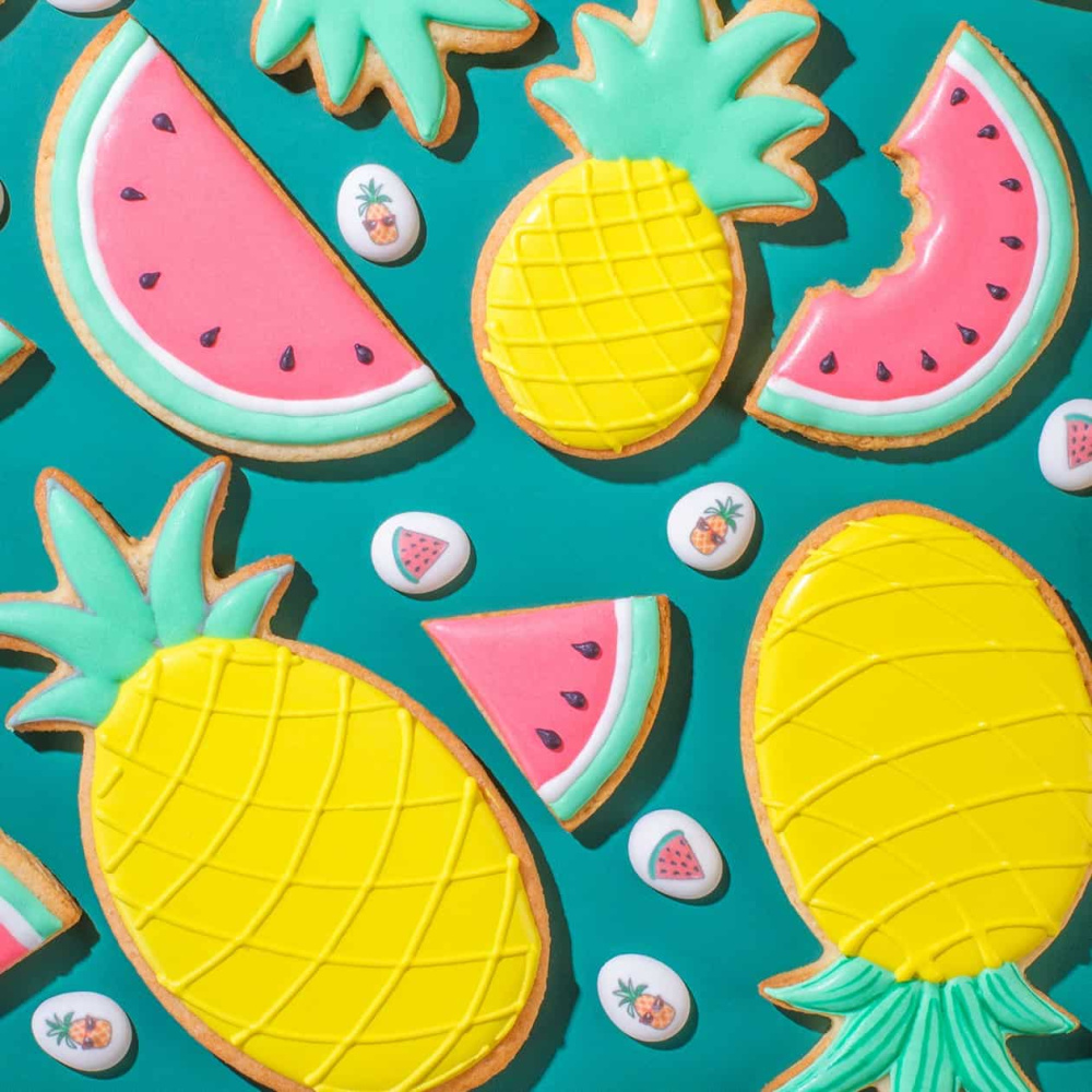Идея декорирования "Арбузы и ананасы" представляет собой пряники, выполненные в форме ананаса и кусочков арбуза. Они оживляются с помощью ярких пищевых красителей от компании Top-Decor, придавая им сочные и яркие оттенки. Пряники также украшены сахарными мини-медальонами "Лето", которые добавляют игривости и тематической акцент. Эта идея декорирования создает веселое и летнее настроение, превращая пряники в аппетитные и забавные сладости, идеально подходящие для праздников, вечеринок или просто для того, чтобы порадовать себя и своих близких.