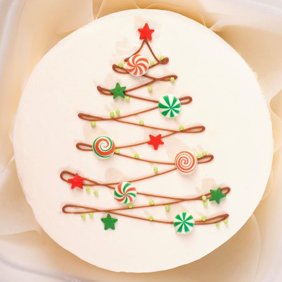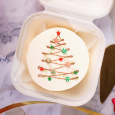 Идея декорирования "Елка с игрушками" представляет собой бенто торт, выполненный в новогодней тематике в оттенках зимней коллекции Top Decor. На изображении видим, что верхняя часть бенто торта украшена узором елки и мини-медальонами "Новогодние карамельки".