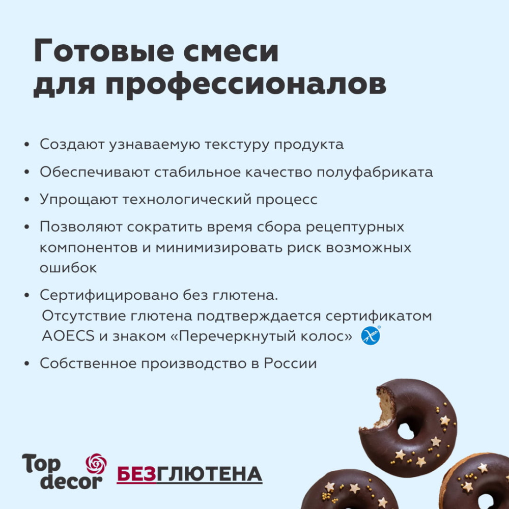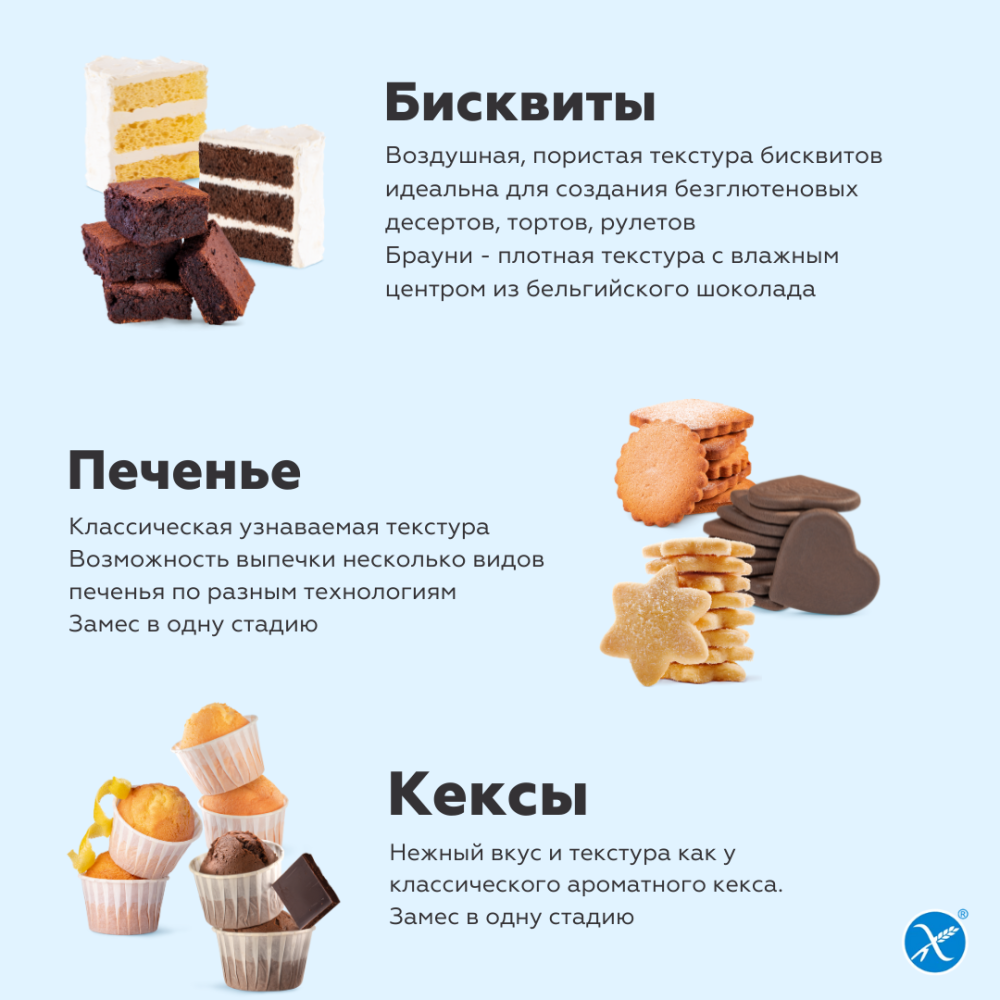 Бисквиты - Воздушная, пористая текстура бисквитов идеальна для создания безглютеновых десертов, тортов, рулетов Брауни - плотная текстура с влажным центром из бельгийского шоколада.