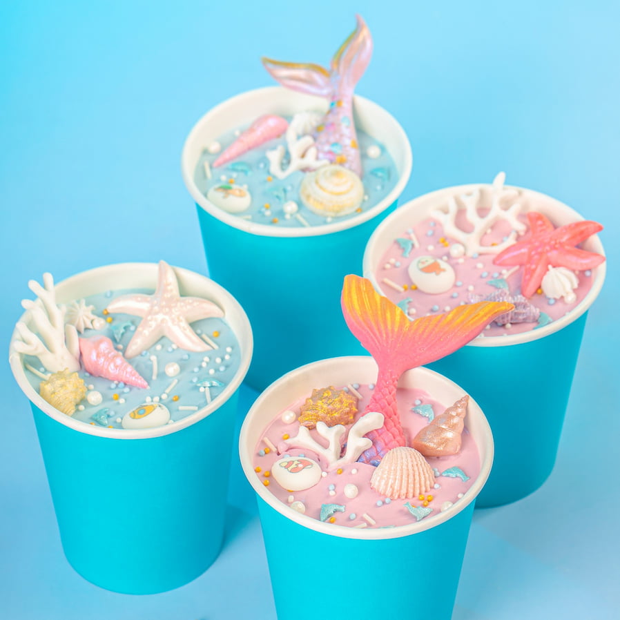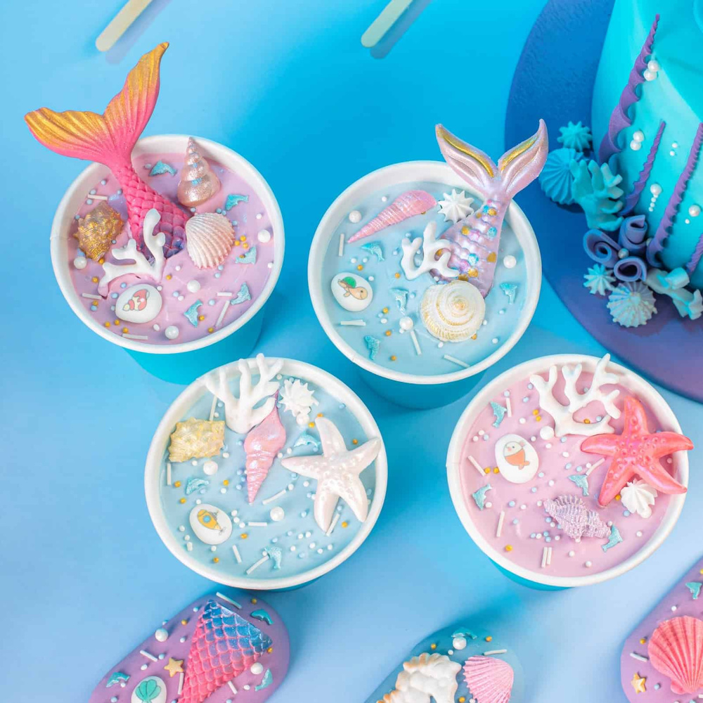 Идея декорирования "Cake to go в морской тематике" представляет собой набор маленьких тортиков, выполненных в весенних оттенках от Top Decor. Каждый Cake to go украшен нежными сахарными мини-медальонами с морской тематикой, фигурками из мастики и разнообразными посыпками от Top Decor, создавая игривый и уникальный дизайн.