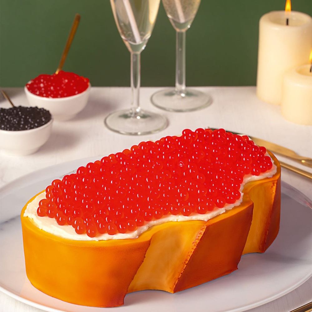Десерт «Бутерброд с икрой» — необычное и эффектное угощение, которое станет изюминкой вашего меню. Булочка выполнена из нежного бисквита и покрыта сливочным кремом, а сверху икру имитируют яркие джус бабл со вкусом клубники.